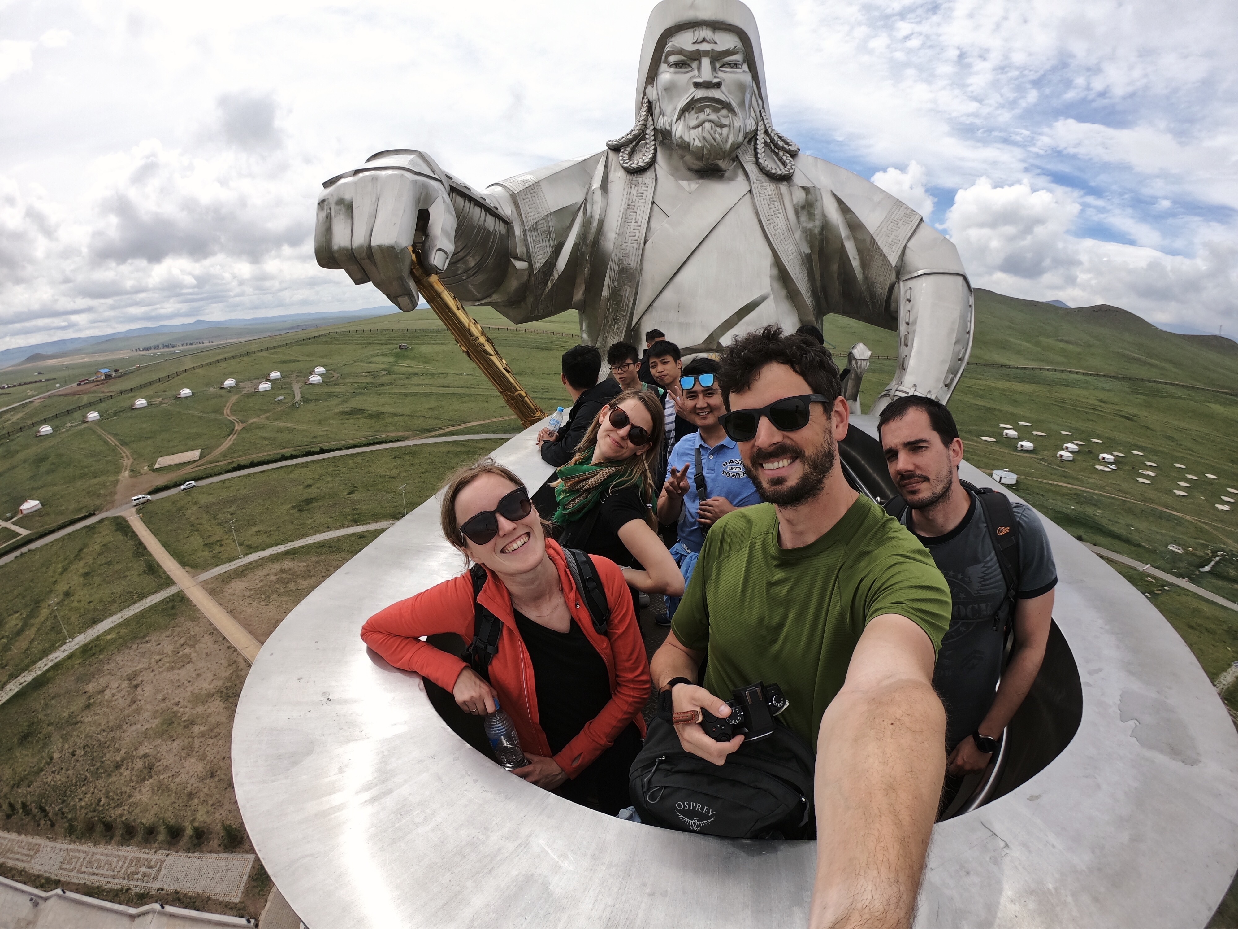 Po kakšnih dveh urah vožnje smo naredili postanek sredi mongolskih step. Tam smo si ogledali največji kip konja na svetu, okoli 40 metrov visok kip koga drugega kot Džingiskana. Kip je zgradila turistična agencija, ki je v lasti sedanjega Mongolskega predsednika. Očitno gradnja takšnega spomenika ni škodila pridobivanju podpore.