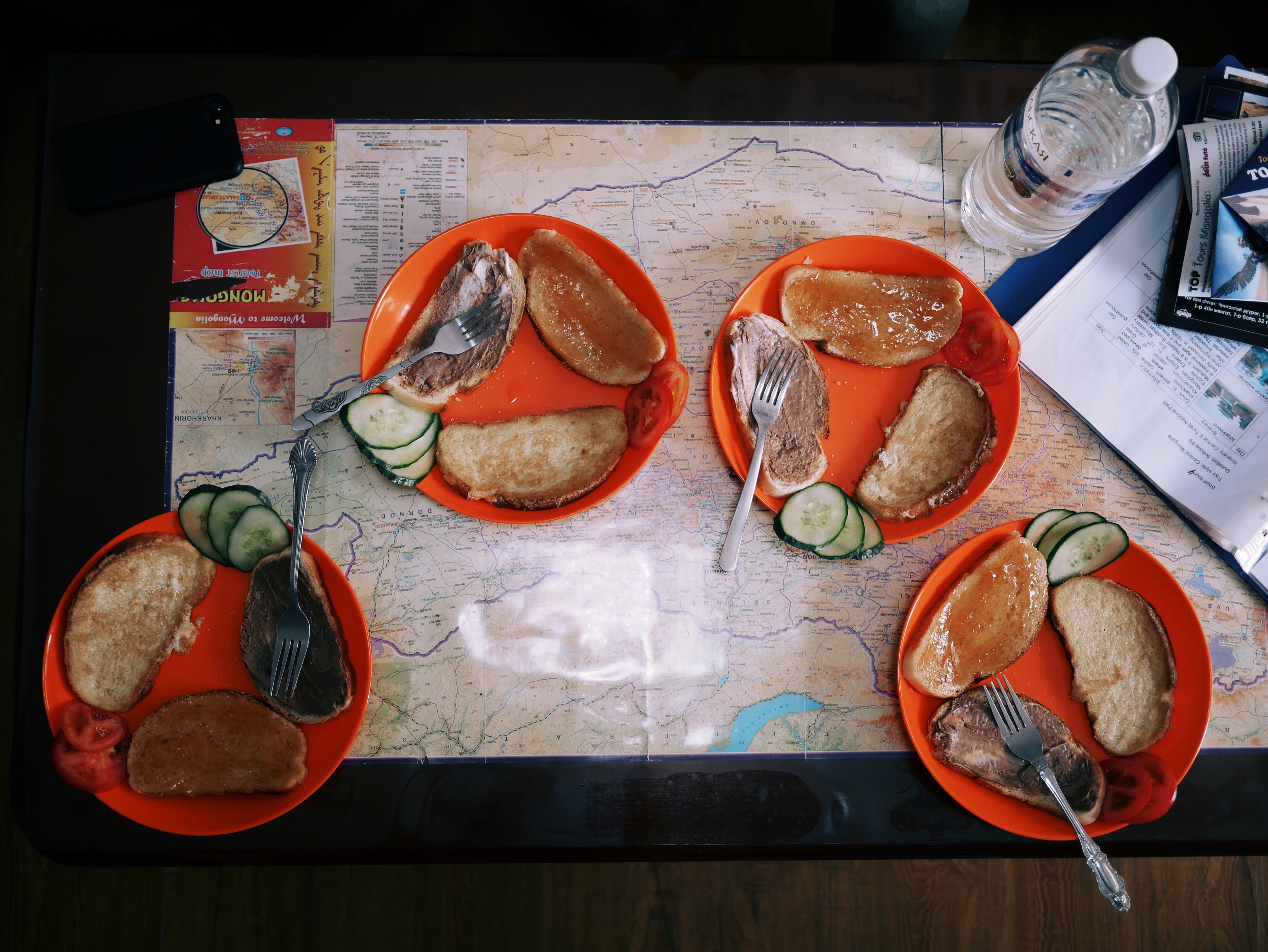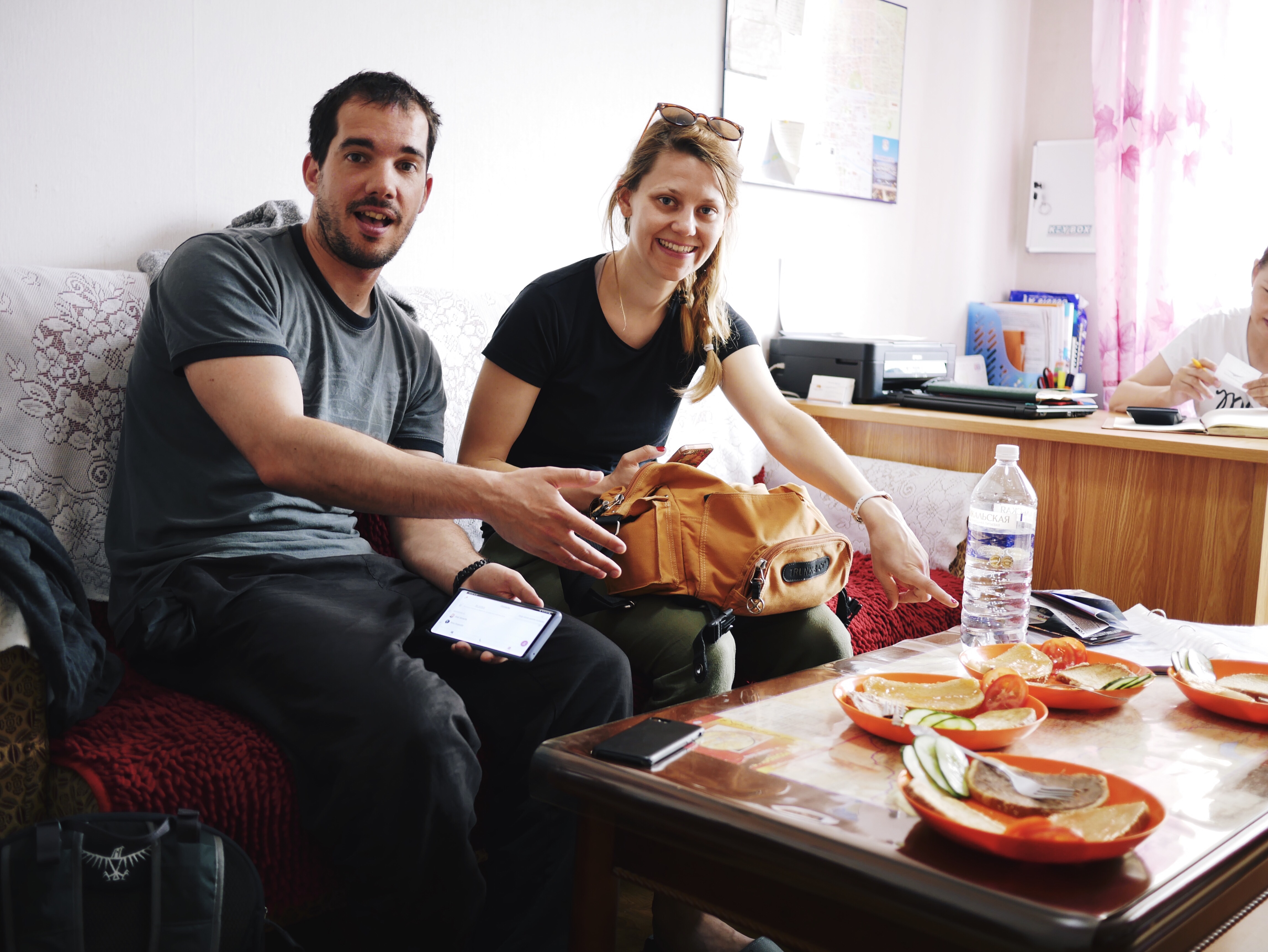 Odpeljali so nas do njihovega hostla, kjer so nam postregli z zajtrkom, rezino kruha z viki kremo, rezino kruha z marmelado in pohano šnito. Šefica Zaya je poleg nas zbrano računala in nam ponudila ceno 49 USD (kar teoretično je nižje od 50). V tem času je v hostel prišla še skupina treh študentov iz Hongkonga, ki se je pridružila našemu avtu, tako da se je končna cena znižala še za 5 na končnih 44 USD. Cena je vključevala prevoz, vodiča, spanje, tri obroke na dan in vse oglede ter jahanje konj in kamel.