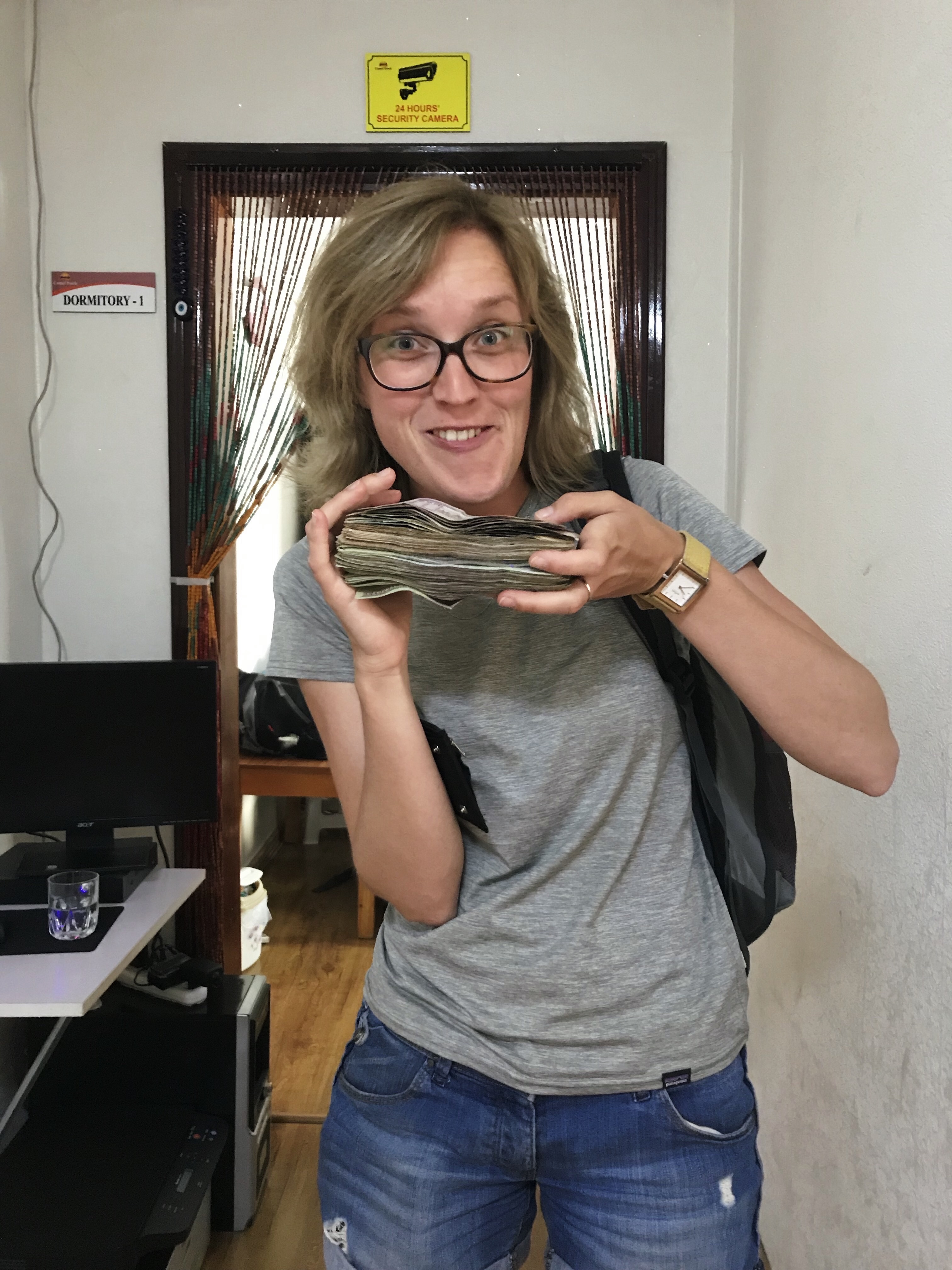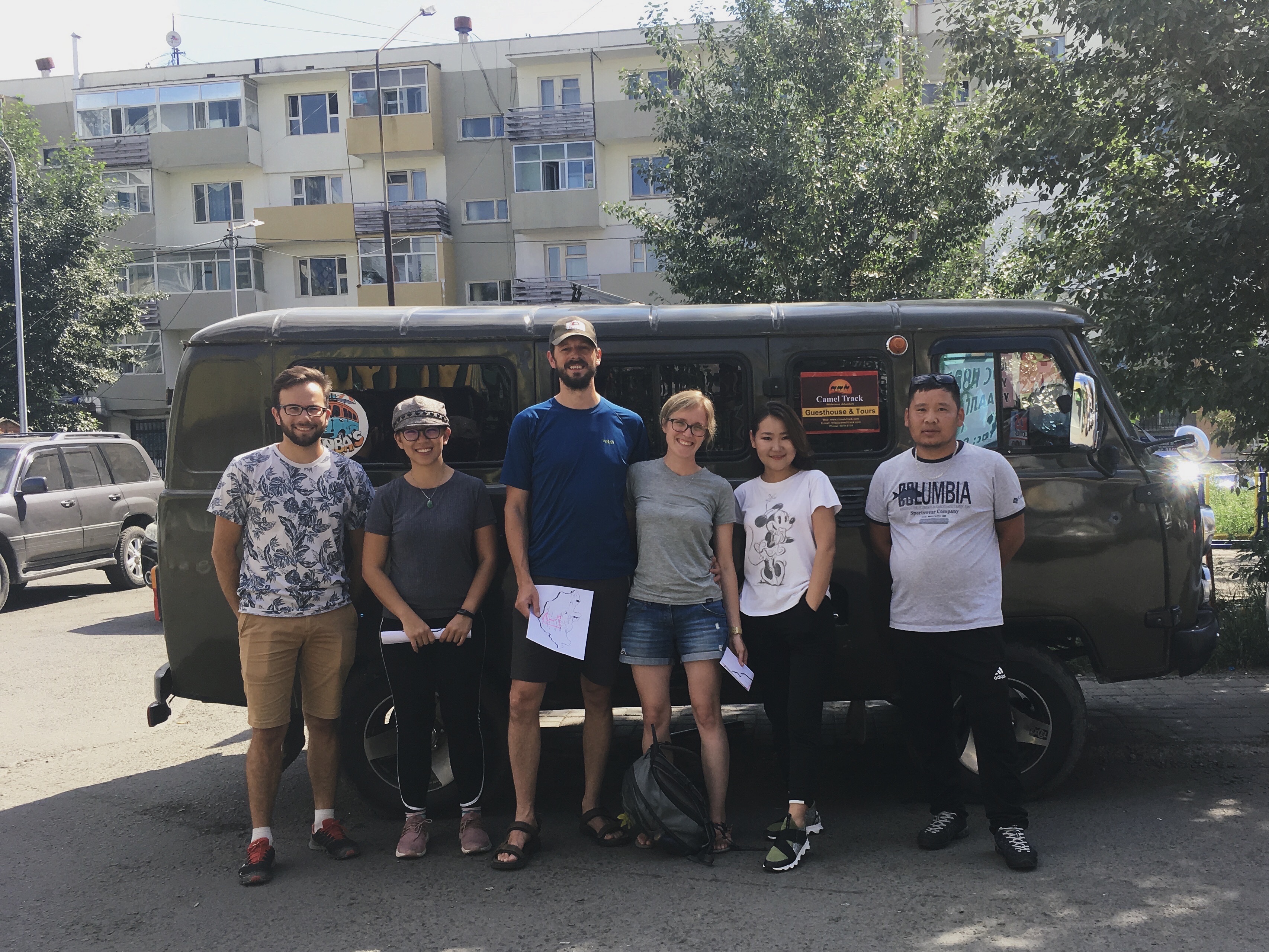 Bajna nas je odložil pred že predobro znanim hostlom Camel Track in povzpeli smo se v 4. nadstropje. Za razliko od prejšnjih dveh obiskov je to jutro v hostlu mrgolelo ljudi. Zayina pisarna je bila tako polna, da smo se vsi komaj razvrstili. Ker v hostlu še vedno niso sprejemali kartic, sva se morala napotiti v sosednjo trgovino in opraviti naporen posel, dvig 2.800.000 tugrikov. V štirih dvigih po 700 tisoč nama je uspelo in v pisarni smo po kakšnih 5 minutah prešteli vseh 2.816.400 tugrikov. Spoznala sva še četrto sopotnico, Indonezijko Elso. Vodičko Yuna sva prav tako že poznala, saj nas je zadnji dan prvega izleta pospremila do UBja. In ekipa je bila popolna.