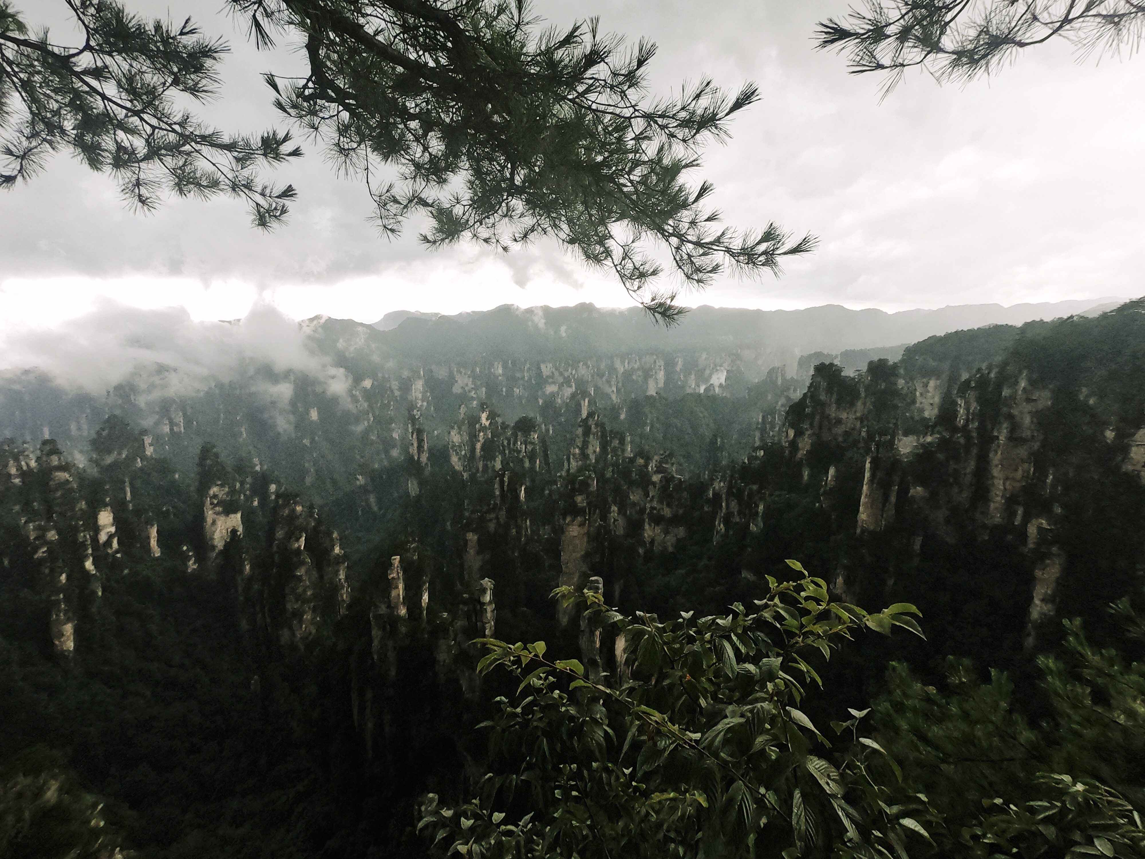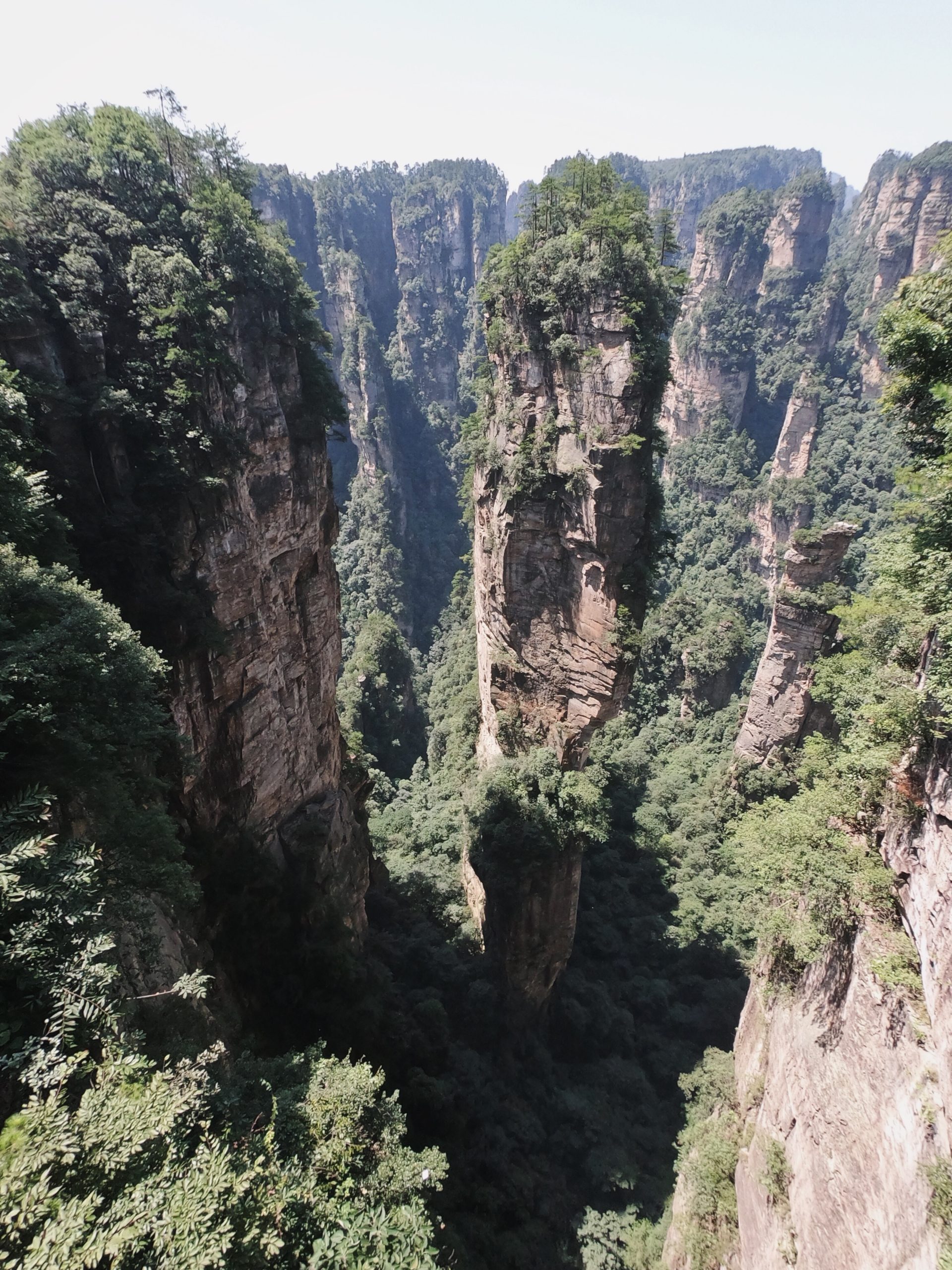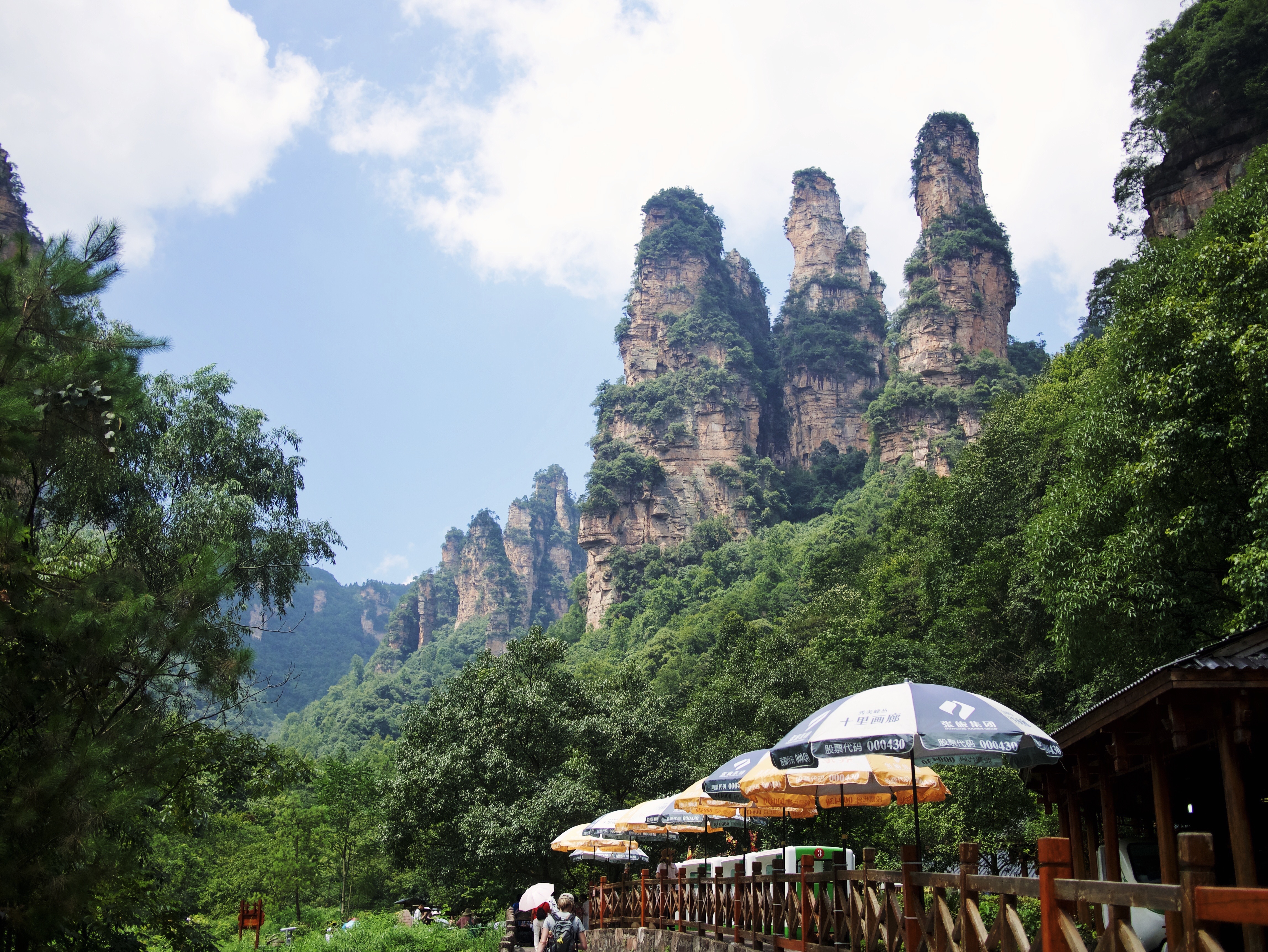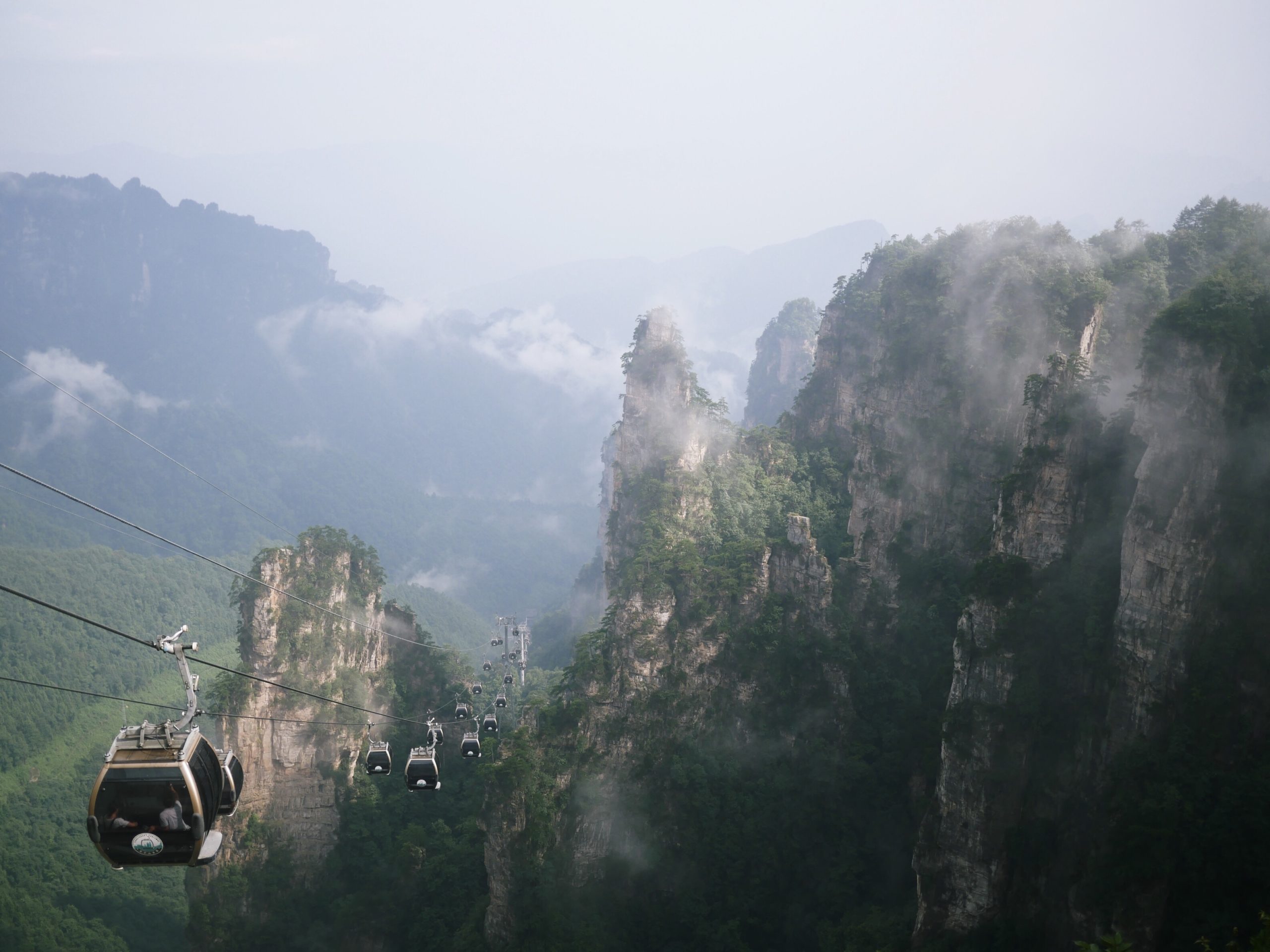 Park Zhangjiajie sestavlja nekaj sto različno oblikovanih kamnenih stolpov, ki so nastali zaradi tektonskega premikanja in ledenih dob, ki so povečale razpoke med pozameznimi deli. Navpične stene se dvigajo tudi do nekaj sto metrov visoko in moram priznati, da so se mi nekajkrat kar zašibila kolena, če smo se sprehajali preblizu roba. Med različnimi deli parka vozijo avtobusi, ki so vključeni v ceno karte, so pa seveda za potrebe kitajskega instantnega turizma tam zgradili tudi dvigalo (!!!) za vzpon ali spust na enega višjih delov in pa dve ali tri gondole. Te pa so bile doplačljive. Z eno od gondol smo se zapeljali tudi mi, saj naj bi se odpeljali nad delom z res lepim razgledom. Ampak seveda je ravno, ko smo stopili v gondolo, začel padat dež, tako da razgledi niso bili tako dobri. So pa meglice, ki so se po tem začele dvigati med špičastimi stožci v enem najbolj znanih delov parka, Tianzi mountains, poskrbele za res čarobne prizore. V nekem trenutku se prav spomnim, da nisem mogla zadržati krika, tako je bilo lepo. In postalo je tudi zelo očitno, od kje naj bi James Cameron dobil idejo za plavajoče gore v filmu Avatar.