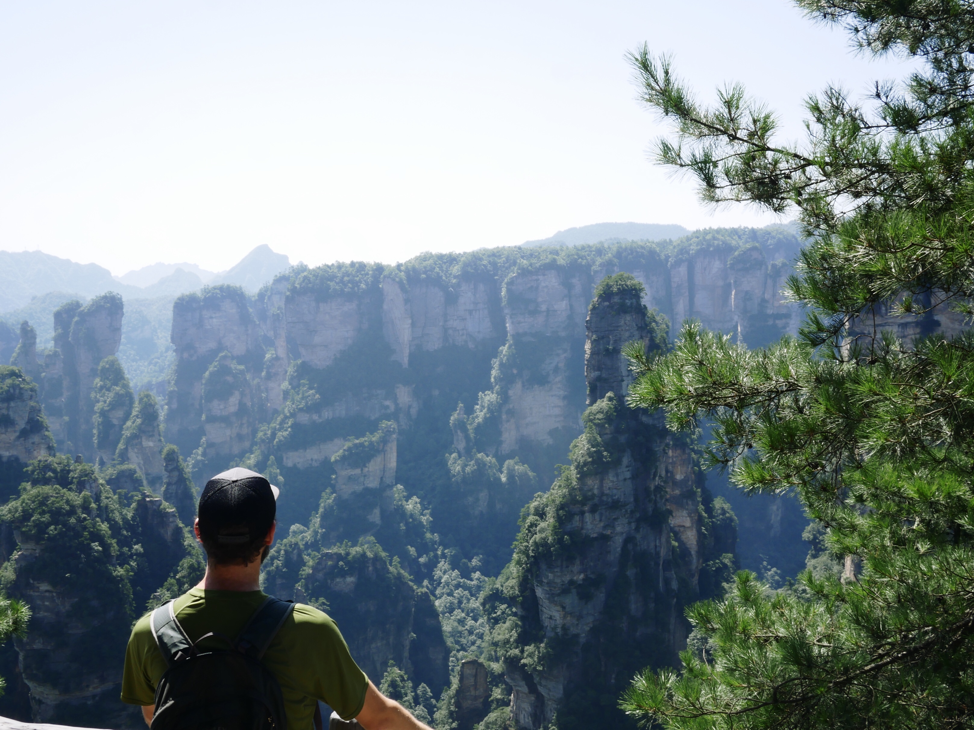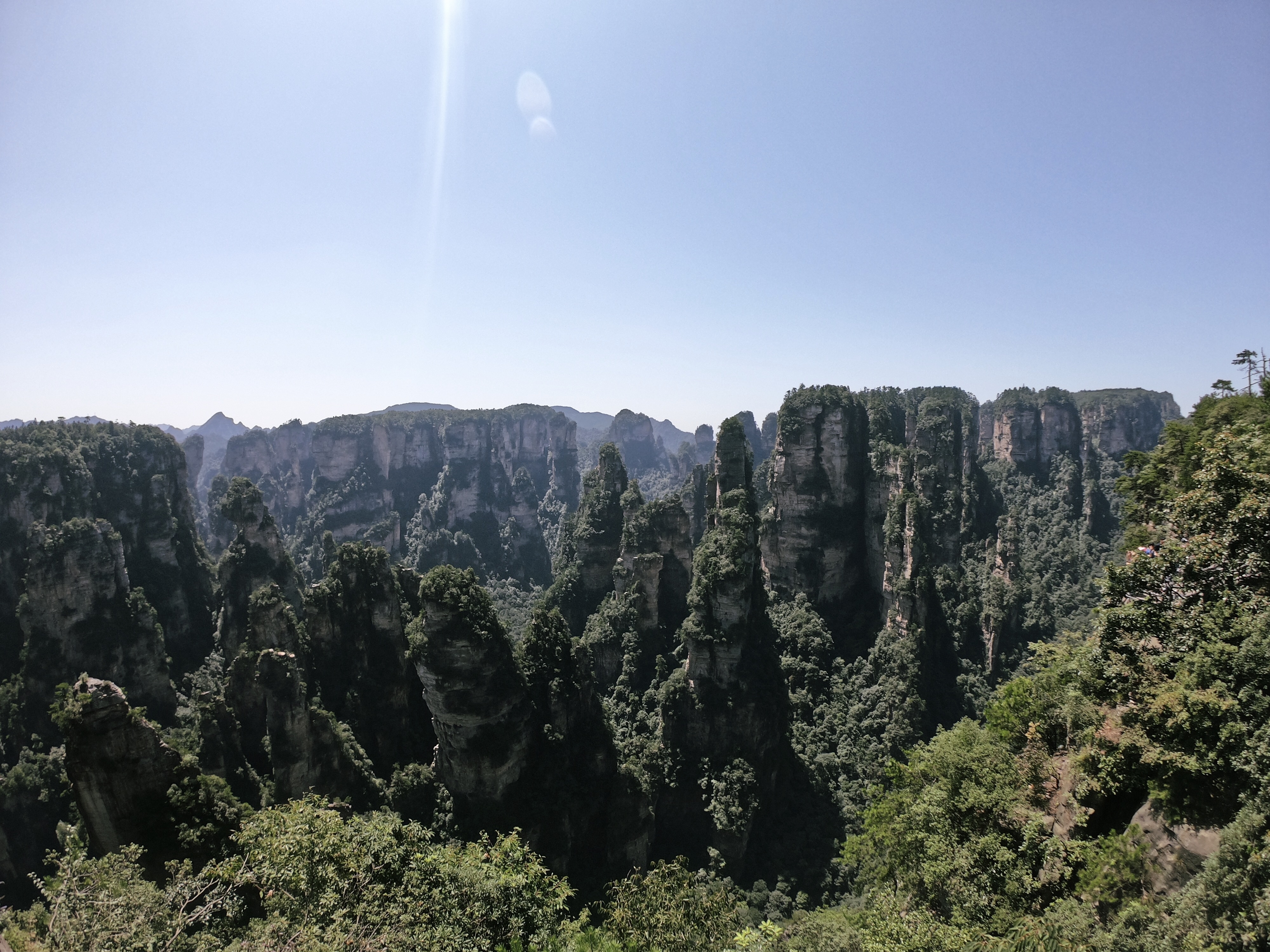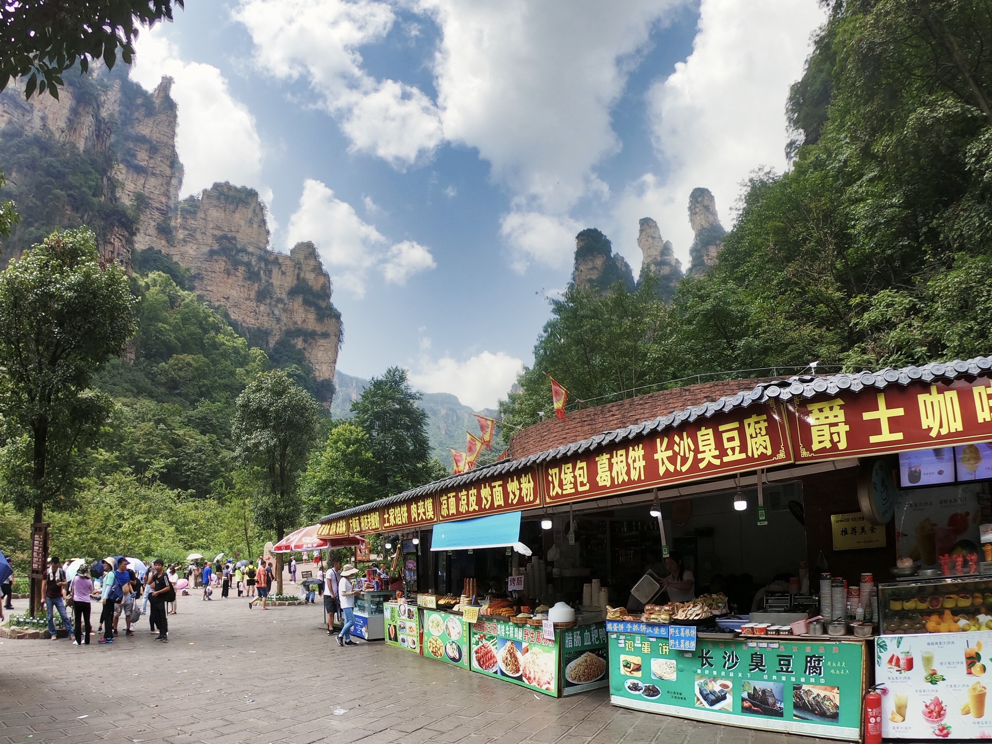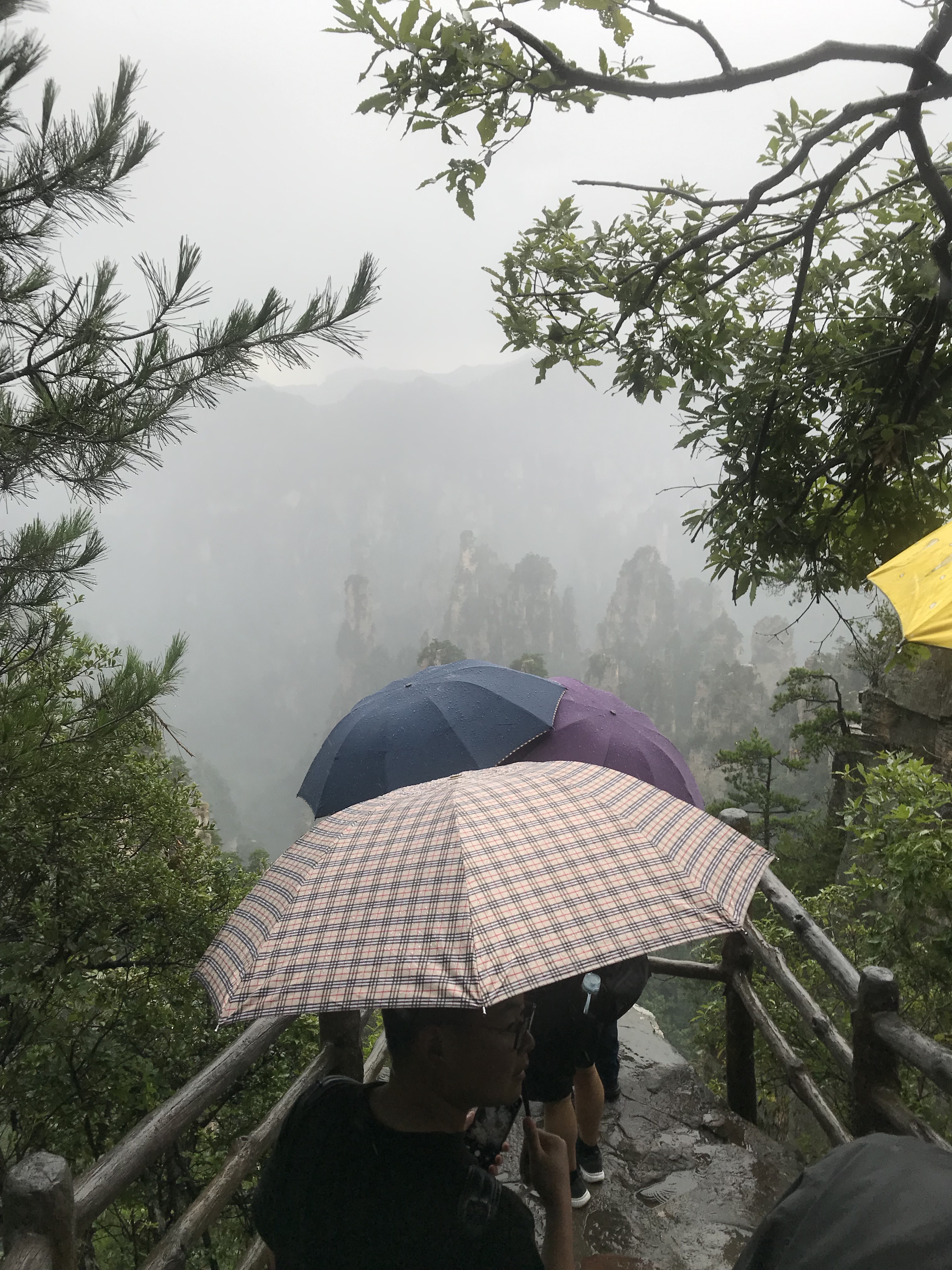 Park Zhangjiajie sestavlja nekaj sto različno oblikovanih kamnenih stolpov, ki so nastali zaradi tektonskega premikanja in ledenih dob, ki so povečale razpoke med pozameznimi deli. Navpične stene se dvigajo tudi do nekaj sto metrov visoko in moram priznati, da so se mi nekajkrat kar zašibila kolena, če smo se sprehajali preblizu roba. Med različnimi deli parka vozijo avtobusi, ki so vključeni v ceno karte, so pa seveda za potrebe kitajskega instantnega turizma tam zgradili tudi dvigalo (!!!) za vzpon ali spust na enega višjih delov in pa dve ali tri gondole. Te pa so bile doplačljive. Z eno od gondol smo se zapeljali tudi mi, saj naj bi se odpeljali nad delom z res lepim razgledom. Ampak seveda je ravno, ko smo stopili v gondolo, začel padat dež, tako da razgledi niso bili tako dobri. So pa meglice, ki so se po tem začele dvigati med špičastimi stožci v enem najbolj znanih delov parka, Tianzi mountains, poskrbele za res čarobne prizore. V nekem trenutku se prav spomnim, da nisem mogla zadržati krika, tako je bilo lepo. In postalo je tudi zelo očitno, od kje naj bi James Cameron dobil idejo za plavajoče gore v filmu Avatar.