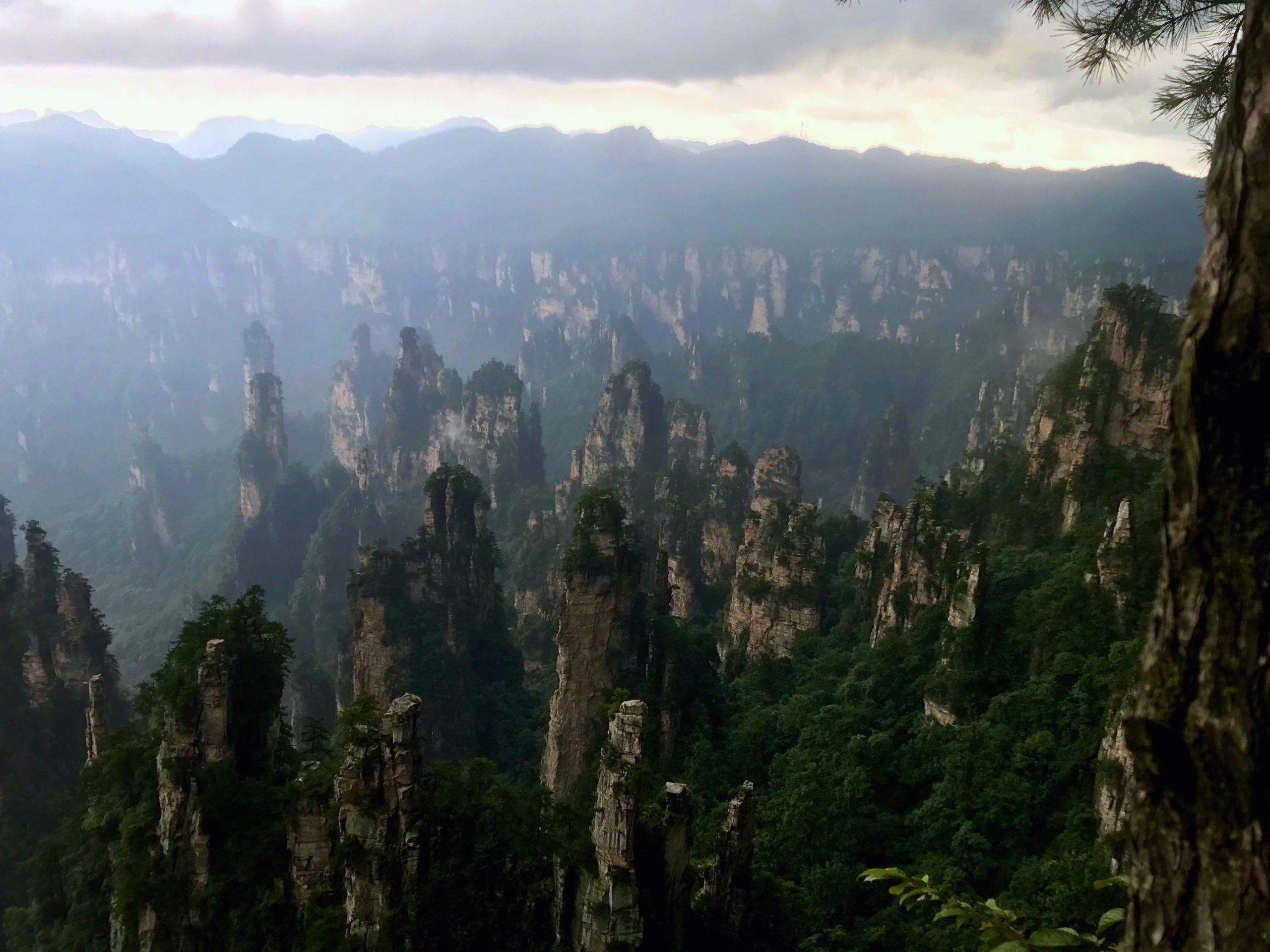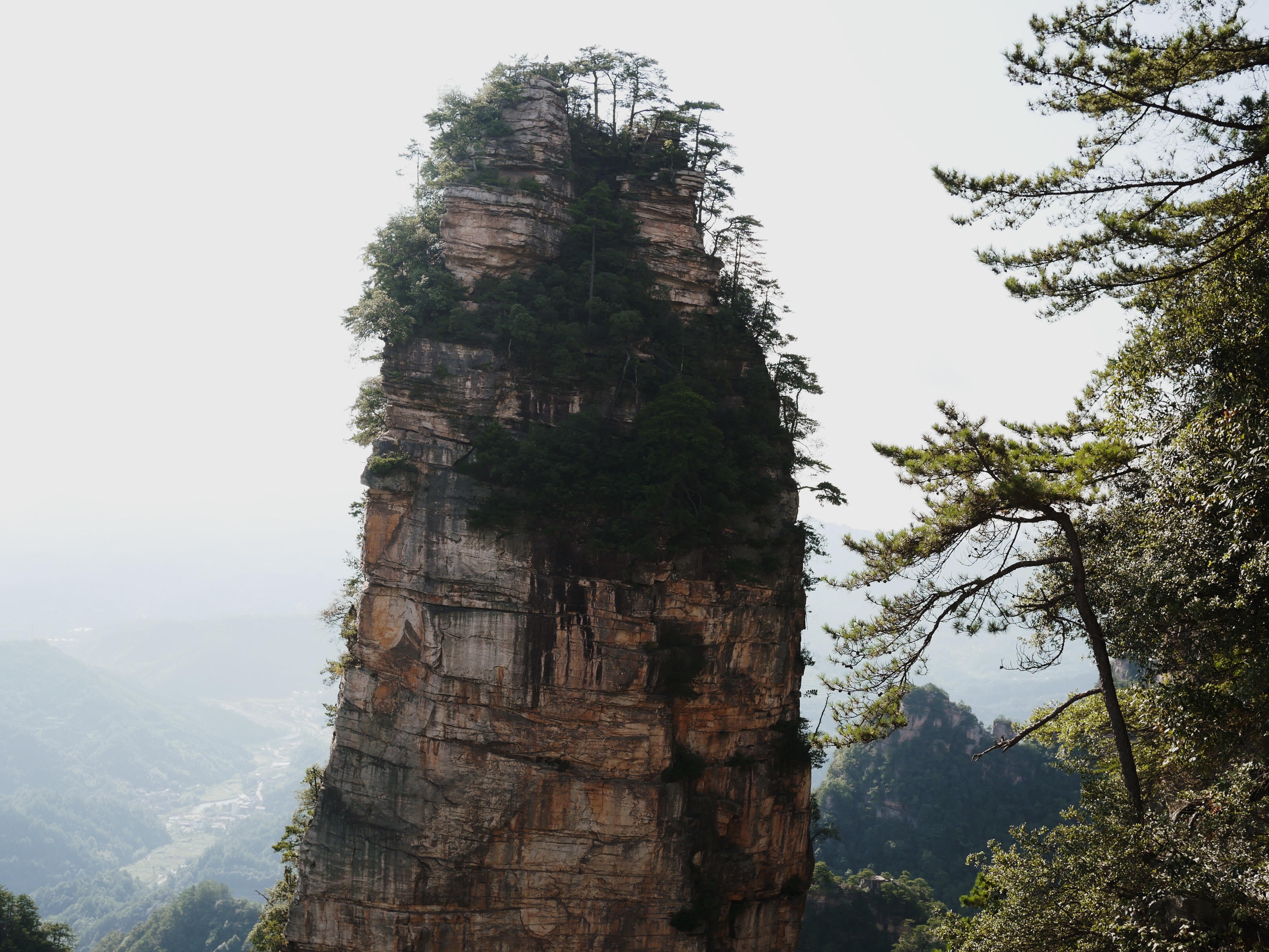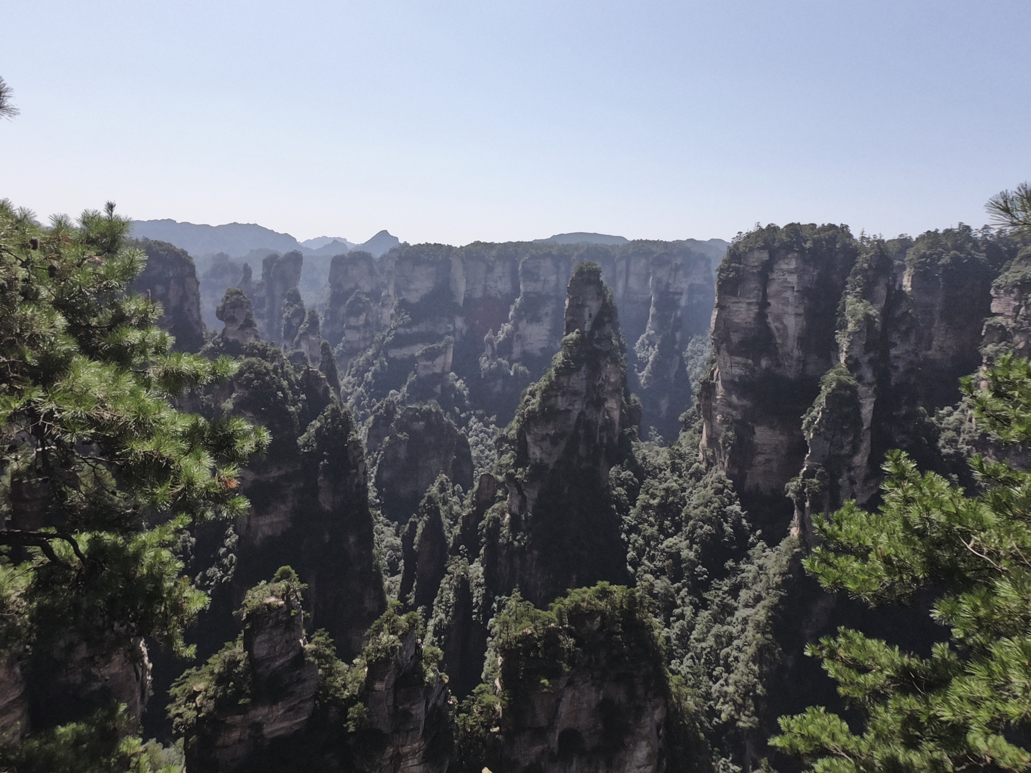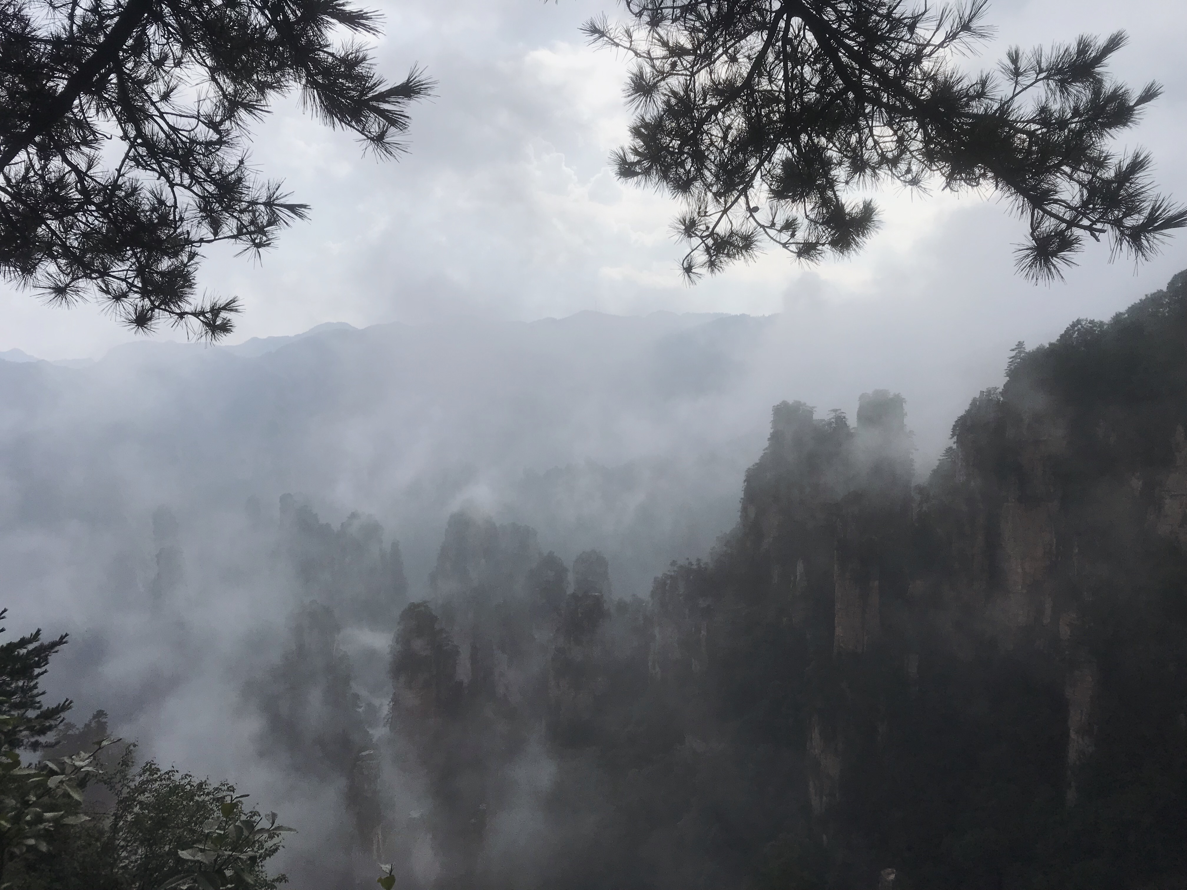 Park Zhangjiajie sestavlja nekaj sto različno oblikovanih kamnenih stolpov, ki so nastali zaradi tektonskega premikanja in ledenih dob, ki so povečale razpoke med pozameznimi deli. Navpične stene se dvigajo tudi do nekaj sto metrov visoko in moram priznati, da so se mi nekajkrat kar zašibila kolena, če smo se sprehajali preblizu roba. Med različnimi deli parka vozijo avtobusi, ki so vključeni v ceno karte, so pa seveda za potrebe kitajskega instantnega turizma tam zgradili tudi dvigalo (!!!) za vzpon ali spust na enega višjih delov in pa dve ali tri gondole. Te pa so bile doplačljive. Z eno od gondol smo se zapeljali tudi mi, saj naj bi se odpeljali nad delom z res lepim razgledom. Ampak seveda je ravno, ko smo stopili v gondolo, začel padat dež, tako da razgledi niso bili tako dobri. So pa meglice, ki so se po tem začele dvigati med špičastimi stožci v enem najbolj znanih delov parka, Tianzi mountains, poskrbele za res čarobne prizore. V nekem trenutku se prav spomnim, da nisem mogla zadržati krika, tako je bilo lepo. In postalo je tudi zelo očitno, od kje naj bi James Cameron dobil idejo za plavajoče gore v filmu Avatar.