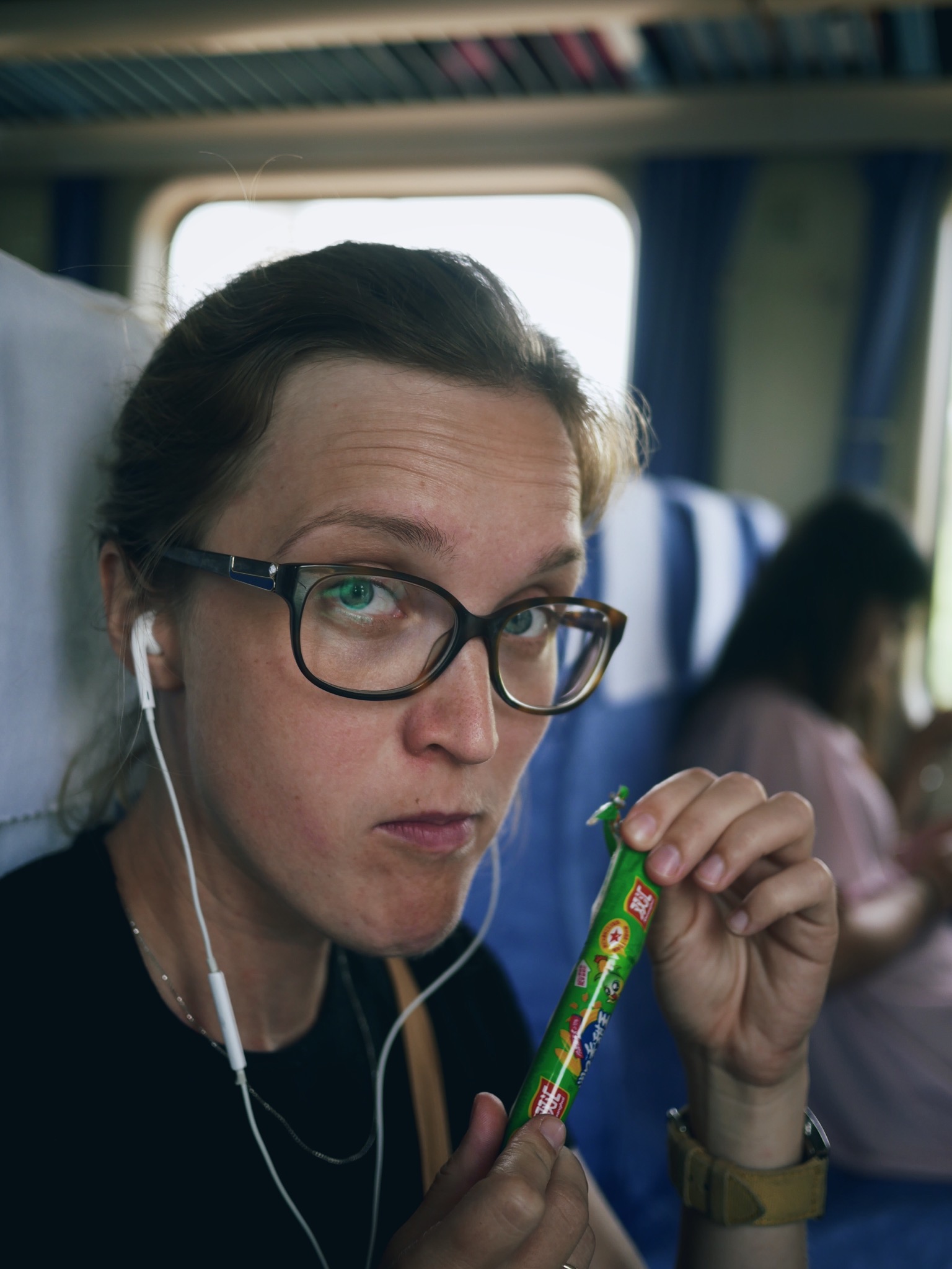 Naslednji dan sva se ponovno opremila s hrano za na vlak. Tako kot sva bila vajena že iz Rusije, so imeli na vseh vlakih vrelo vodo, tako da sva si lahko skuhala instantne nudlčke. Srečna Zala :) Domačini pa so to vodo uporabljali tudi za pripravo čaja. Vsi so okrog hodili s steklenimi flaškami in termovkami, ki so imele poseben predalček za čajeve list, in tega so potem konstantno zalivali z vročo vodo in srkali čaj. Tudi na tej postaji sva spoznala oboževalce in paparace, ki so naju slikali. Simpatične punce sva potem še cel dan srečevala po vlaku, jim mahala in se smejala.