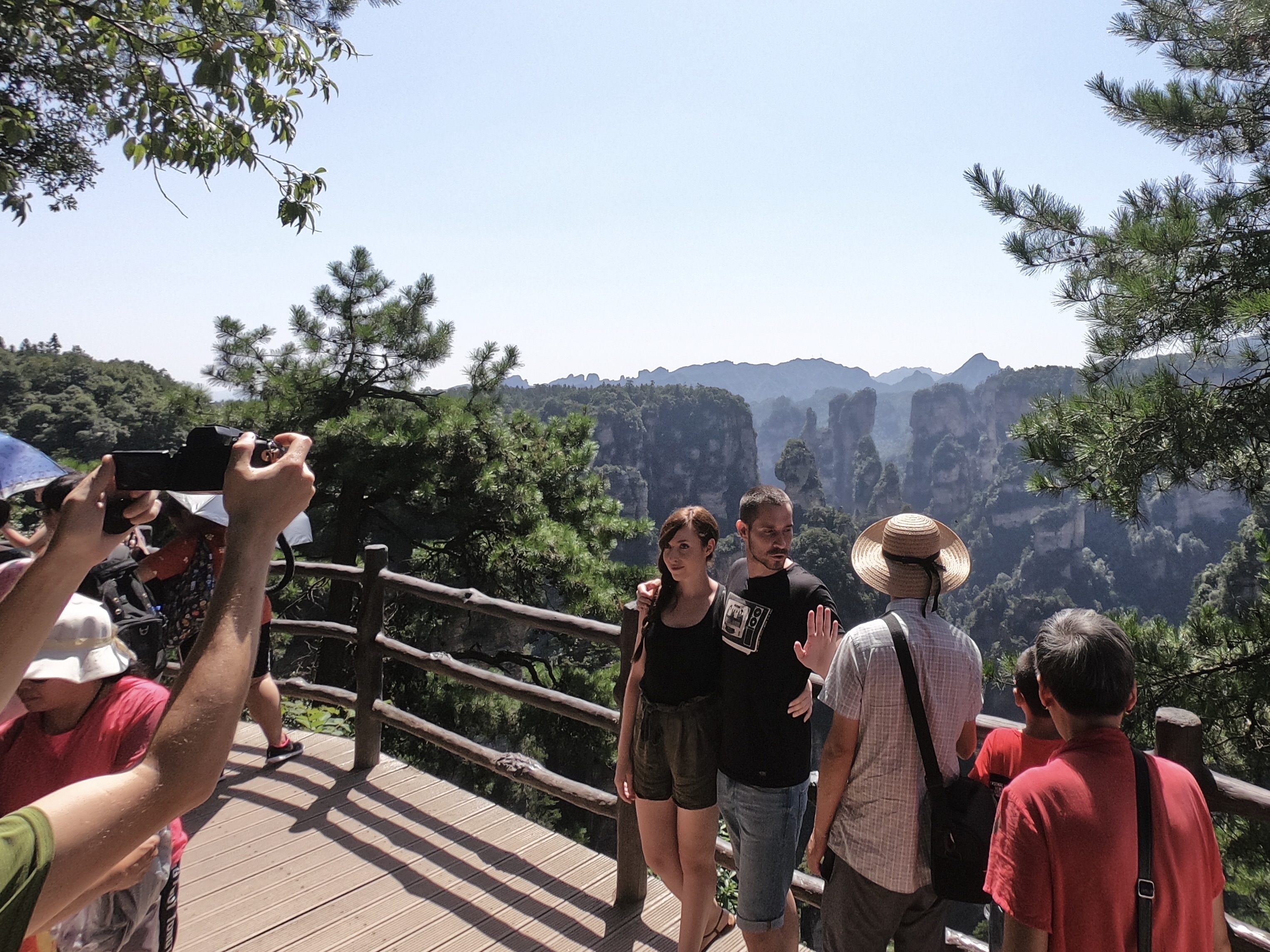 Drugi dan smo si pogledali tudi najbolj znane stebre imenovane Avatar mountains in se s težavo prebijali skozi zastoje ljudi. Prava vaja za potrpežljivost. Dobra lastnost tega instantnega turizma pa je bila, da je bilo pet minut stran od glavnih poti, povsem prazno in tiho in le kakšna evropska duša, s katero smo si prav olajšano izmenjali nasmeške in se vedno lepo pozdravili. Smo pa v parku doživeli tudi najbolj krvav boj za mesto na avtobusih. Na postajah, kjer so se ustavljali avtobusi so bile namreč lepo speljane ograje za čakanje. Ko je pripeljal avtobus so uzlužbenci nato skupino čakajočih spustili mimo zapore, da so se lahko povzpeli na avtobus. Sistem bi lahko lepo deloval, ampak ne smemo pozabiti, kje smo. Na eni izmed postaj smo z Ano in Josejem že prišli do konca vrste in ko je pripeljal avtobus smo se lepo počasi sprehodili proti njemu, misleč, saj zdaj, ko smo mimo zapore, bomo lepo prišli gor. Amaterji. Od zadaj so mimo nas začeli teči ljudje, nas prehiteli in z rokami zaprli vhod v avtobus, da so gor spravili svoje prijatelj. Ko smo končno vstopili gor, ni bilo več prostora in tisto je bila kaplja čez rob. Kanček potrpežljivosti in olike, ki smo ga še premogli, je izpuhtel in sklepčni smo bili, da od zdaj naprej igramo njihovo igro. In na koncu je res postala igra, Tadej je postal še posebaj tekmovalen. Sva pa na eni izmed avtobusnih povezav spoznala mlada Nemca in se smeje strinjala, da če v tem kaosu trpiva midva, se morata onadva počutiti še toliko huje.