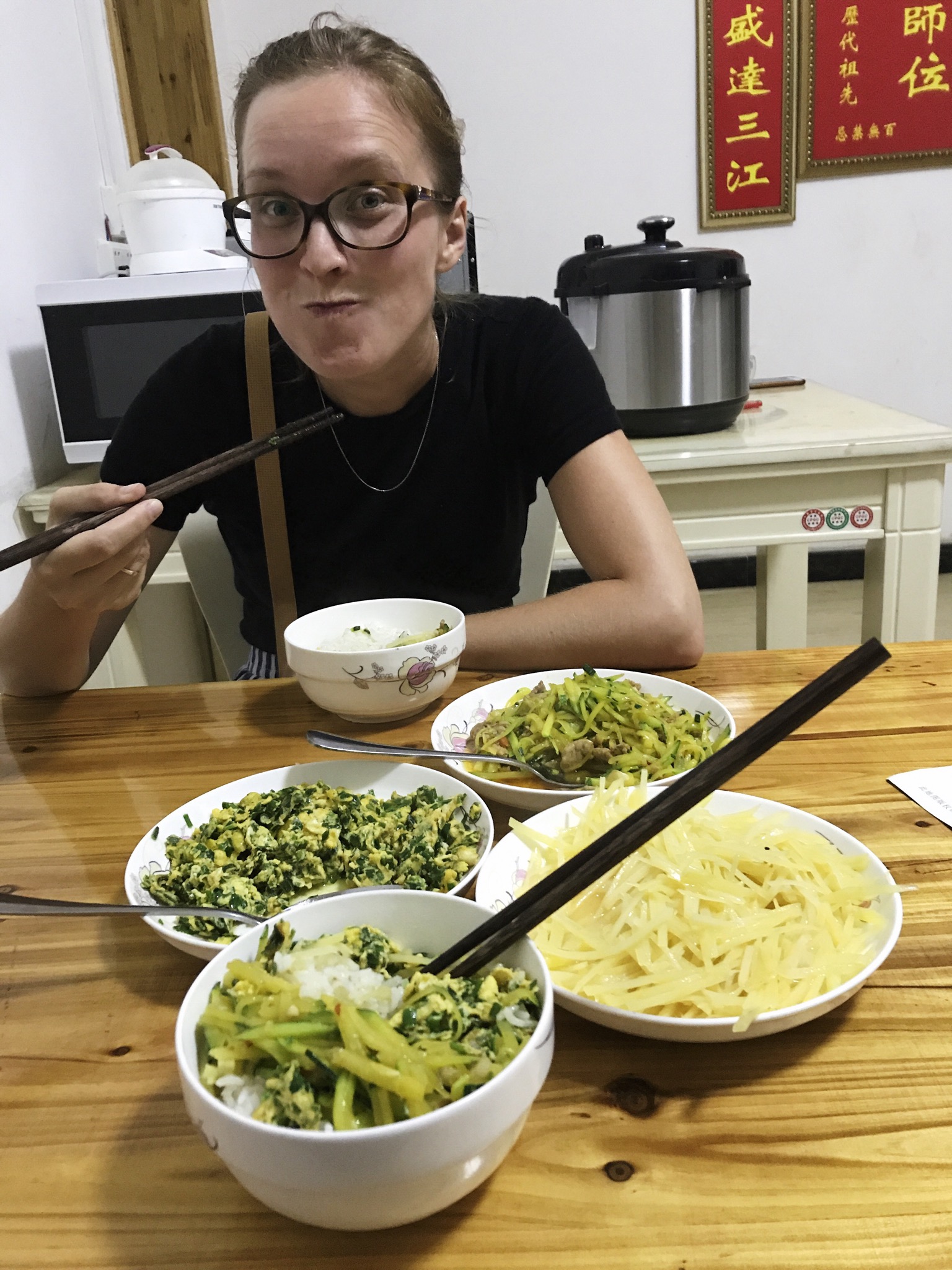 Ta del poti pa nama še vedno prikliče enega lepših spominov, in ko pomislim na najine izkušnje z domačini, se spomnim teh dni na vlaku. Prvi dan so na sedežih poleg naju sedeli dve gospe, punca in mlajši fant. Kot vedno, so nekaj minut bulili v naju in potem je gospa poleg Tadeja, kar po Kitajsko, začela pogovor. Takoj sva potegnila ven telefon s prevajalnikom, in ugotovila, da jo zanima, če sva iz Amerike, pa kam greva, če nama je všeč Kitajska… Potem pa je gospa izpod sedeža privlekla lavor, poln kuhanih jajc. Vsakemu je pomolila enega v roke. Malo začudeno sva jo gledala, potem pa je nakazala, da ga naj kar olupiva in pojeva. Za tem pa so iz torb začeli vleči vse svoje prigirzke in nama ponudili še klobasice pa še nekaj pikantnih ribjih prigrizkov. Najprej sva vse lepo odklonjala, pa niso prav nič upoštevali najinega branjenja in nama kar porinili vse v roke. Fant je nato opazil, da ima Tadej umazane roke in mu prijazno ponudil še prtiček. Res prijetna izkušnja. Preostanek poti nismo prav veliko več govorili. Je pa tik pred koncem poti iz drugega dela vagona prišel še en mlajši fant in se postavil pred naju in vprašal: “Are you hot?” Nikoli ne bomo izvedeli, ali je to tudi želel vprašati, ali se je kaj izgubilo v prevodu. V mestu Xingyang nisva imela veliko časa, je pa bilo to spet eno od tistih milijonskih mest, za katera sploh še nisva slišala. Za večerjo sva si privoščila malo “naše” hrane in se odpravila na steak. Dobila sva neke umetne zrezke, ki so zgledali, kot da bi bili narejeni v laboratoriju, saj so imeli na obeh straneh enako maščobe in okus ni nič kaj spominjal na govedino.