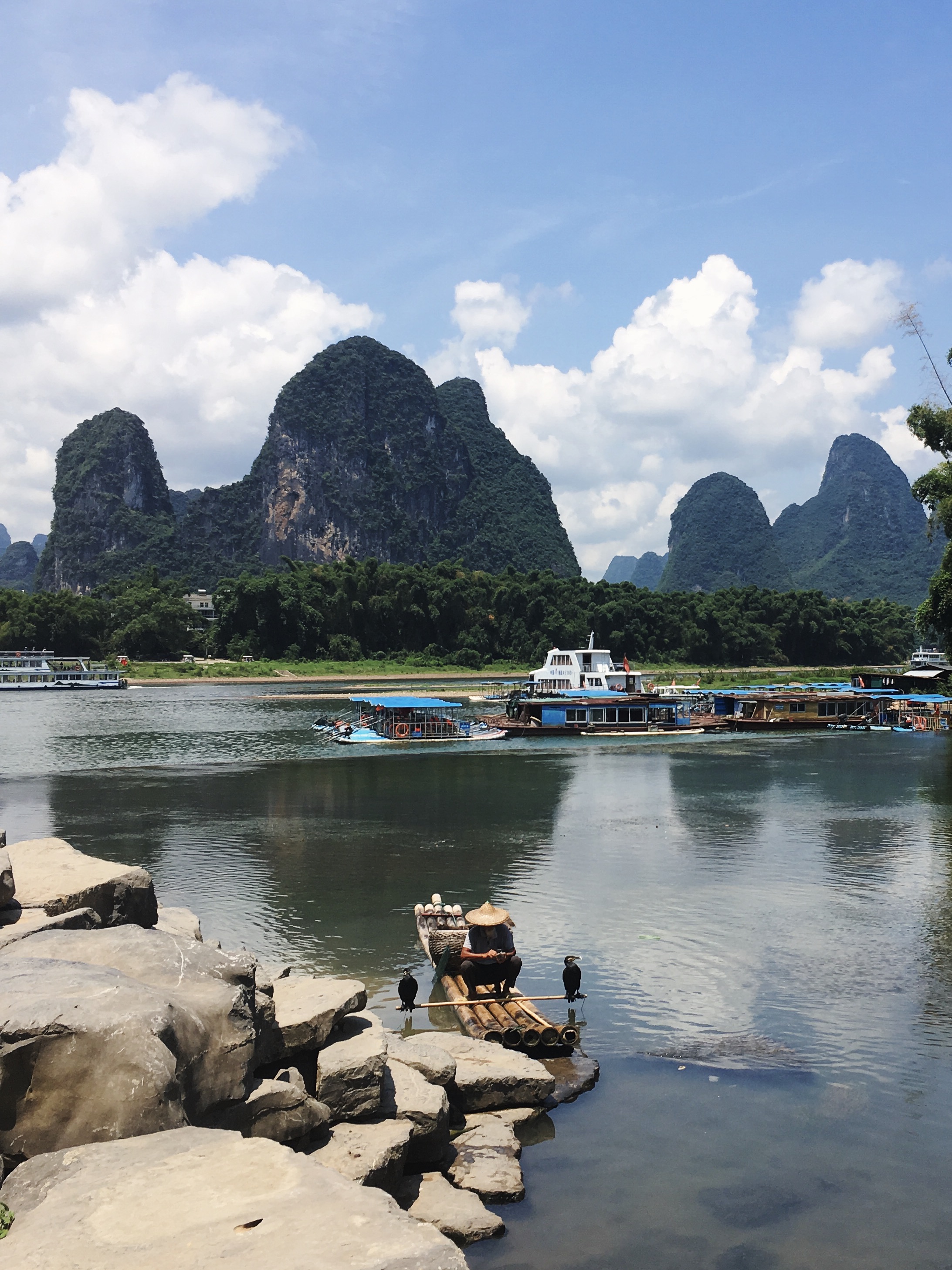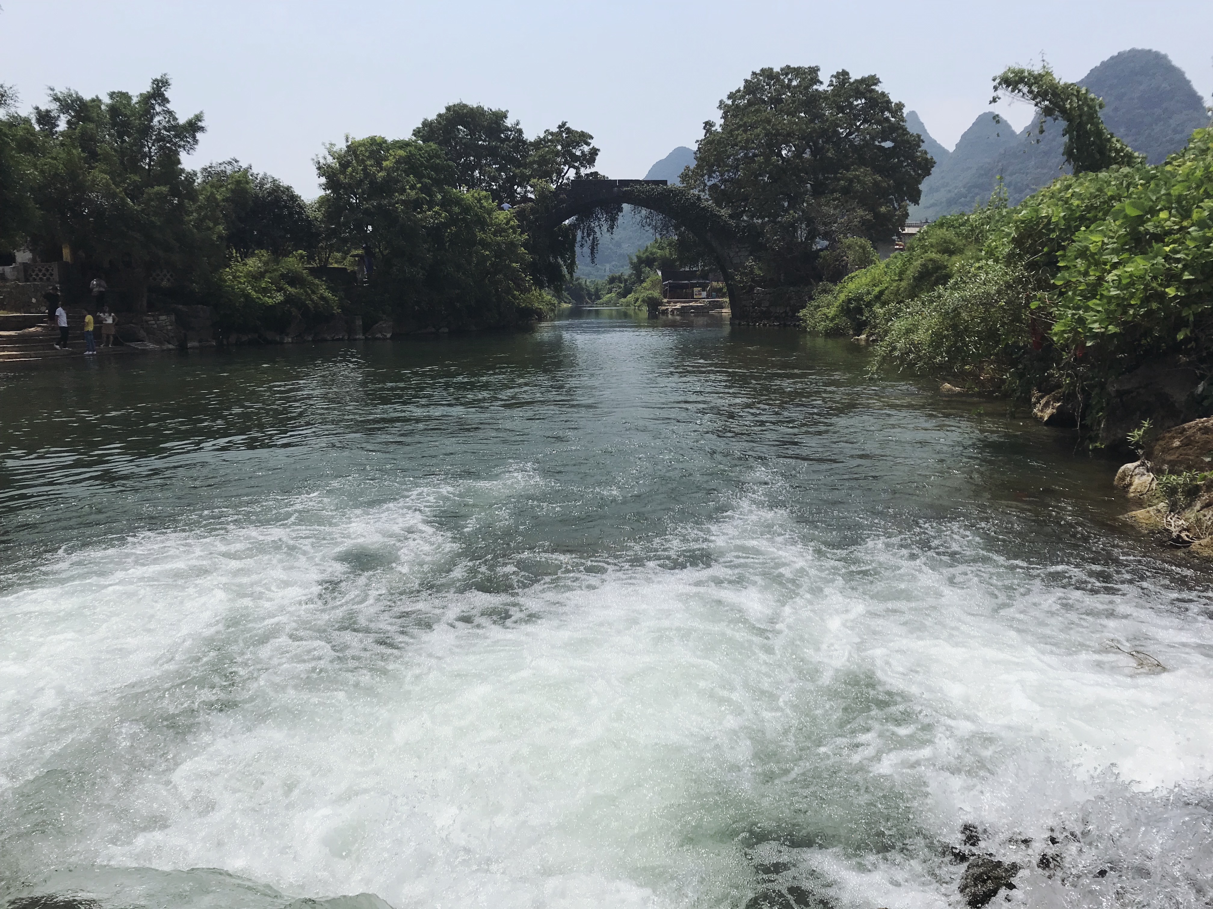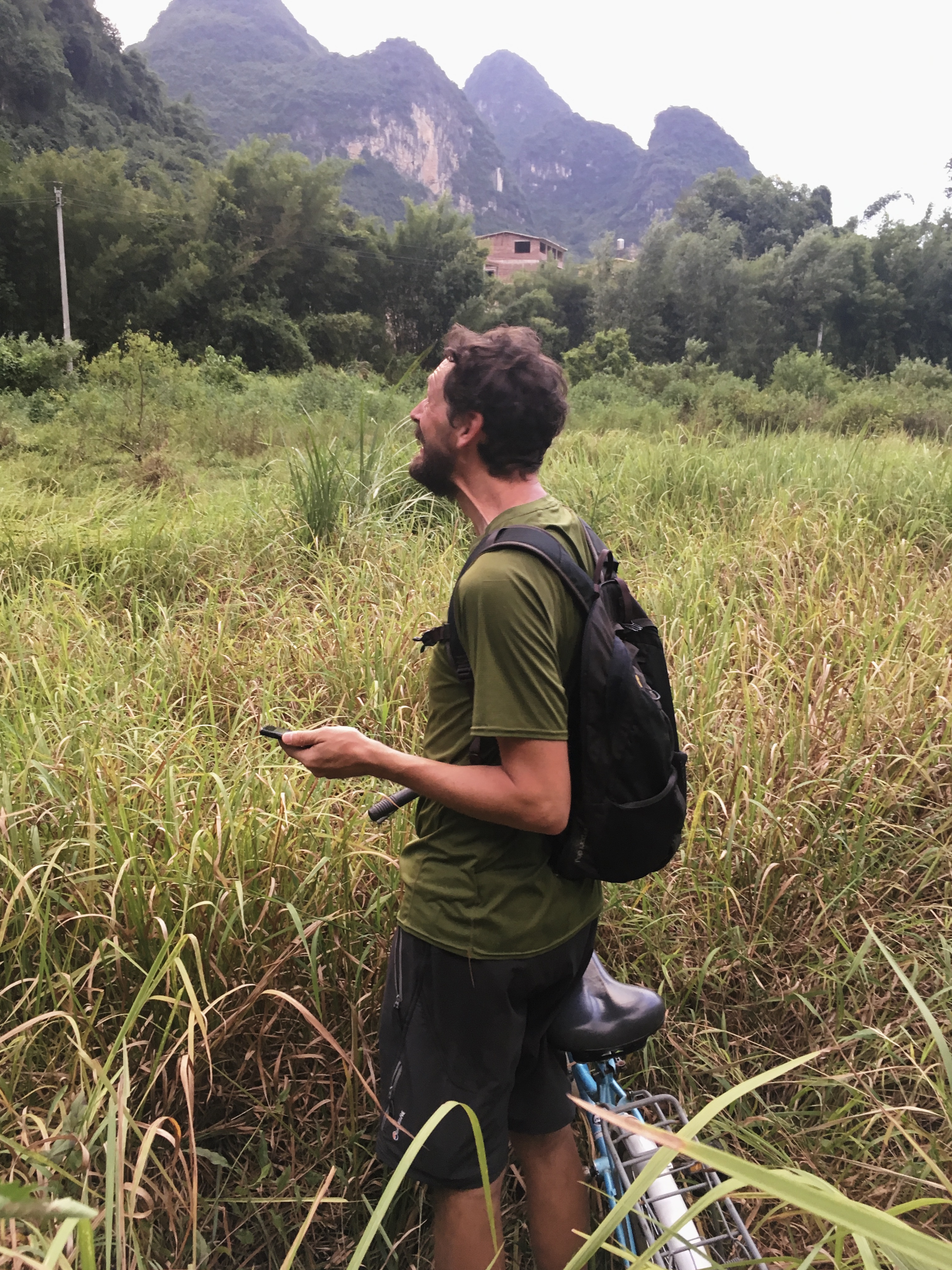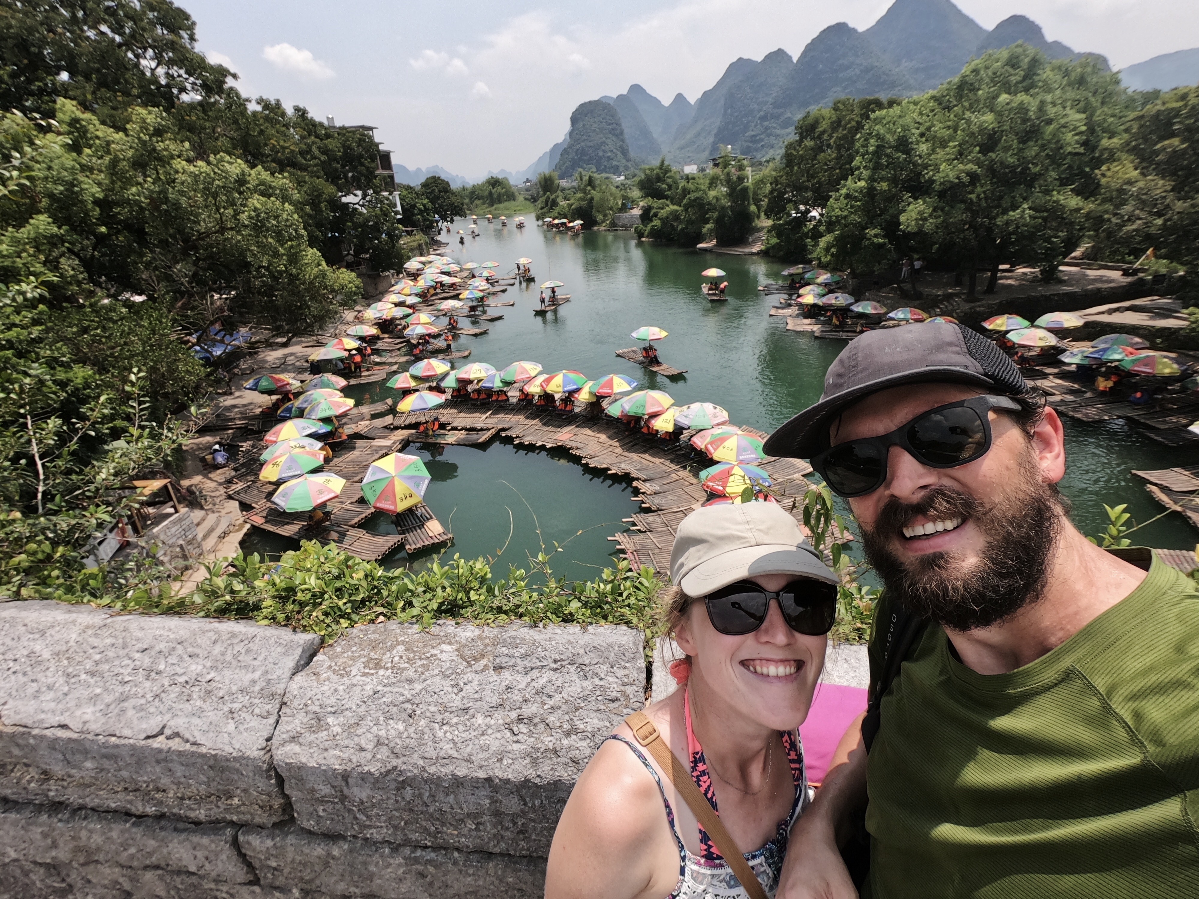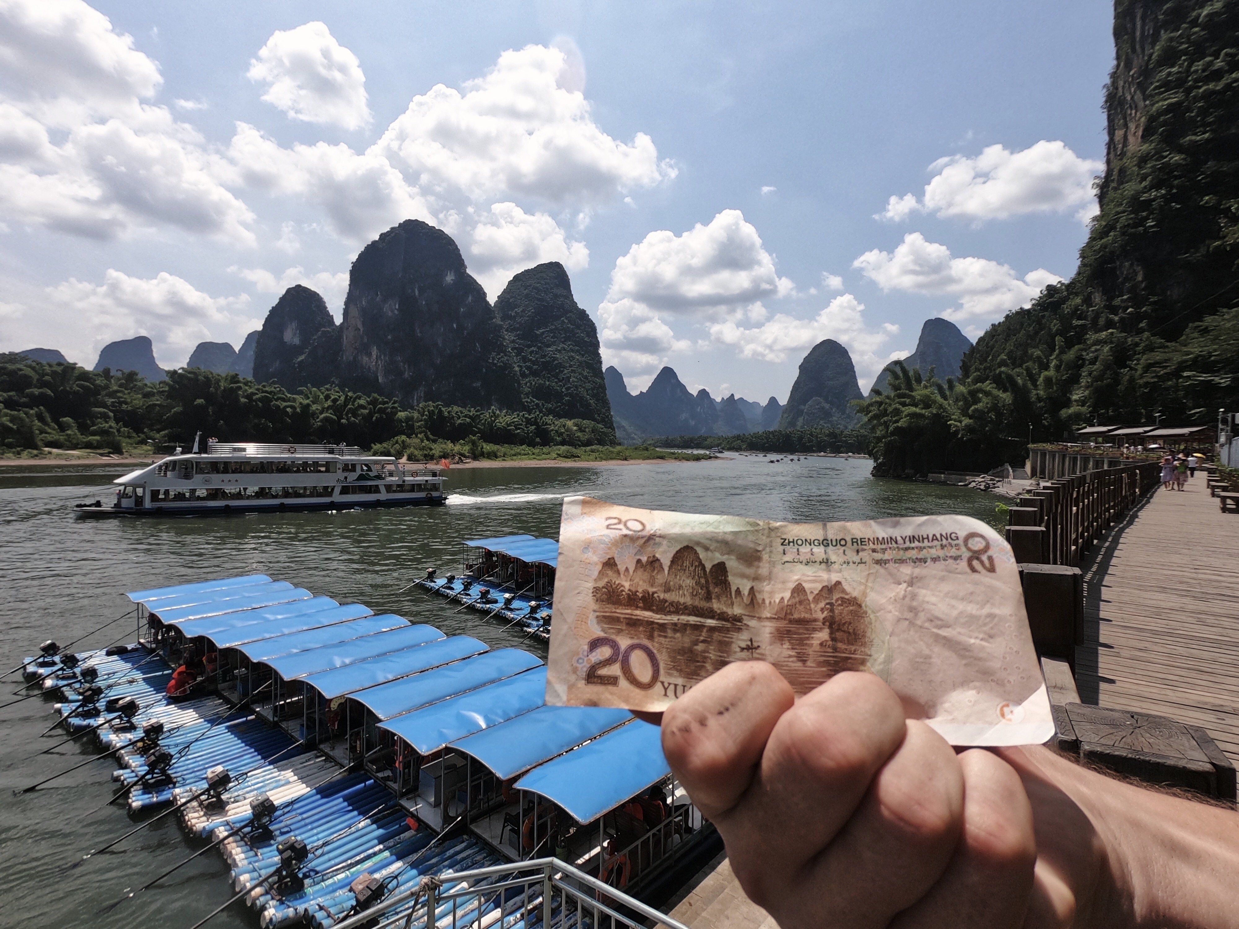 Drugi dan pa sva najela skuter, da sva se lahko dopeljala do okoli 50 km oddaljenega mesta Guangxi, ki ga prav tako obdajajo stožčasti hribi. Znan pa je predvsem po tem, da je upodobljen na bankovcu za 20 juanov. Pot je bila zabavna, čelade so se komaj držale skupaj in bile bolj za okras kot kaj drugega. V mestu sva splezala na enega od stožcev in spoznala prijazen kitajski par, ki nama je na vrhu ponudil breskve. Tam smo se prijetno zaklepetali in povedala sta nama svoji zgodbi, kako je eden zaradi poostrenih razmer med Kitajsko in ZDA zapustil New York, drugi pa se vrnil iz Oxforda. Nič kaj navdušena nad svojo situacijo sta razlagala o dolgih delovnikih, veliki konkurenci na trgu dela, neplačanih nadurah in še in še. Nobenemu od nas se ni mudilo iz hladne sence, ampak naju je začel preganjati čas, saj sva imela pred sabo še nekaj kilometrov.
