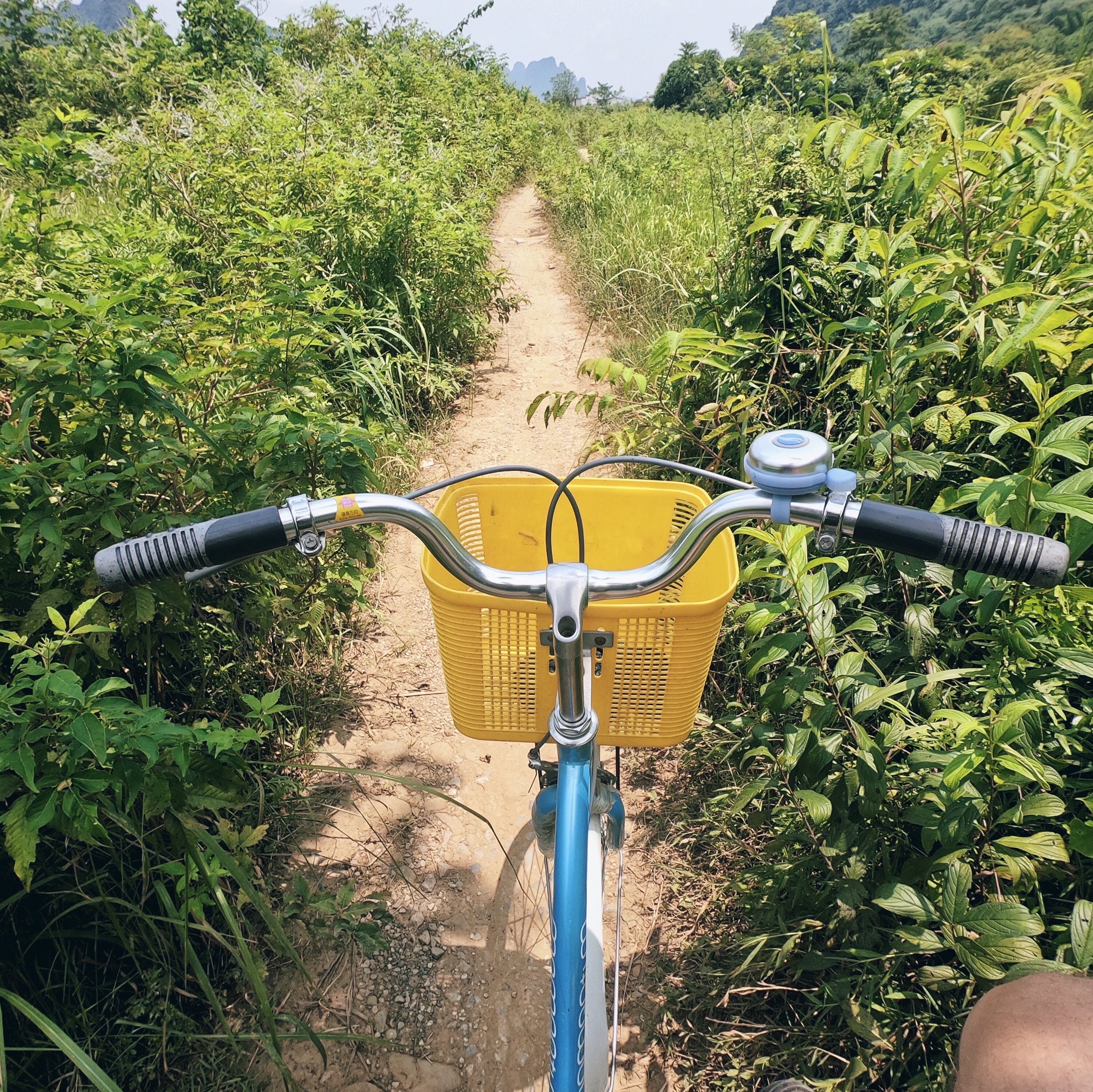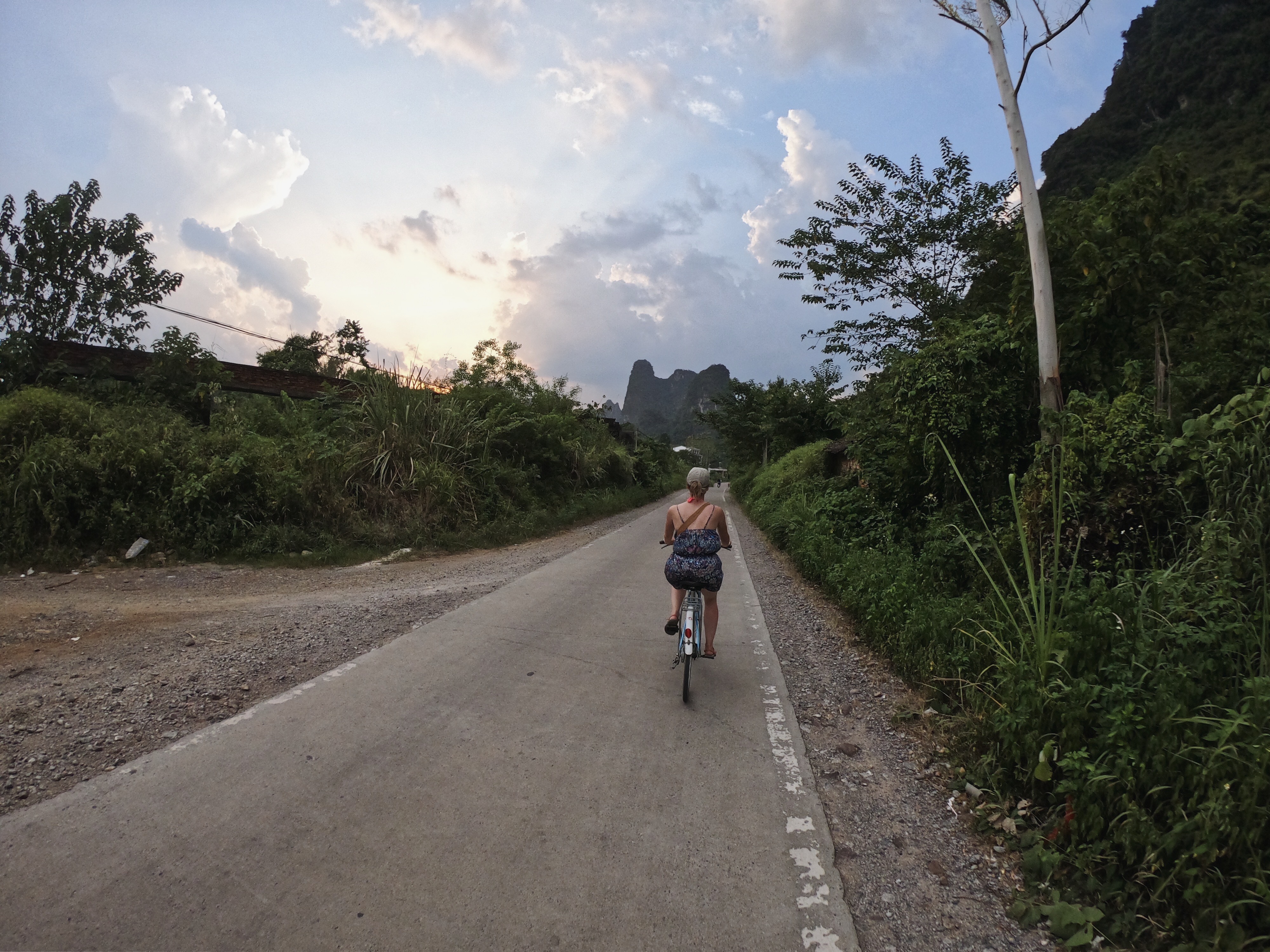 Naslednji dan sva si v vasi sposodila kolesa in se odpravila na izlet ob reki do dveh starih mostov. Končno je napočil tudi trenutek, ki sva ga čakala več tednov. Končno sva lahko skočila v vodo in se v tej vročini načofotala v hladni reki. Opoldne sva se vrnila v hostel, saj največje vročine nisva hotela preživeti na soncu. Za popoldanski kolesarski izlet sva se odpravila v nasprotni smer, saj sva po priporočilu iz hostal želela pogledati sončni zahod na enem izmed zaobljenih gričkov. Ob glavni cesti sva se ustavila in se osvežila s porcijo lubenice, in ko sva prispela do vznožja hriba, naju je varnostnik pregnal stran, ker se hrib ob 6h zapre :) Tako nama ni ostalo drugega, kot da se počasi vrneva proti hostlu. Tja pa nisva hotela po isti poti, zato je Tadej na maps.me našel neko alternativno pot, ki naju je speljala na neka polja. Iz polj pa mimo grmičevja do travnika. Ampak te travice so bile ostre kot britev in visoke do kolen, tako da se je ob vsakem koraku vsaj ena zarezala v nogo. Kmalu sem se uprla in skoraj zjokala, da ne morem več naprej, saj so male ranice začele ob stiku z znojem neznosno srbeti. Kljub temu, da sva skoraj videla glavno cesto na drugi strani, sva tako obrnila in po tretji poti odkolesarila proti domu. Vmes naju je ujela noč, Tadeja je skoraj ugriznil pes, ampak na koncu sva le supešno sklenila kolesarski dan.