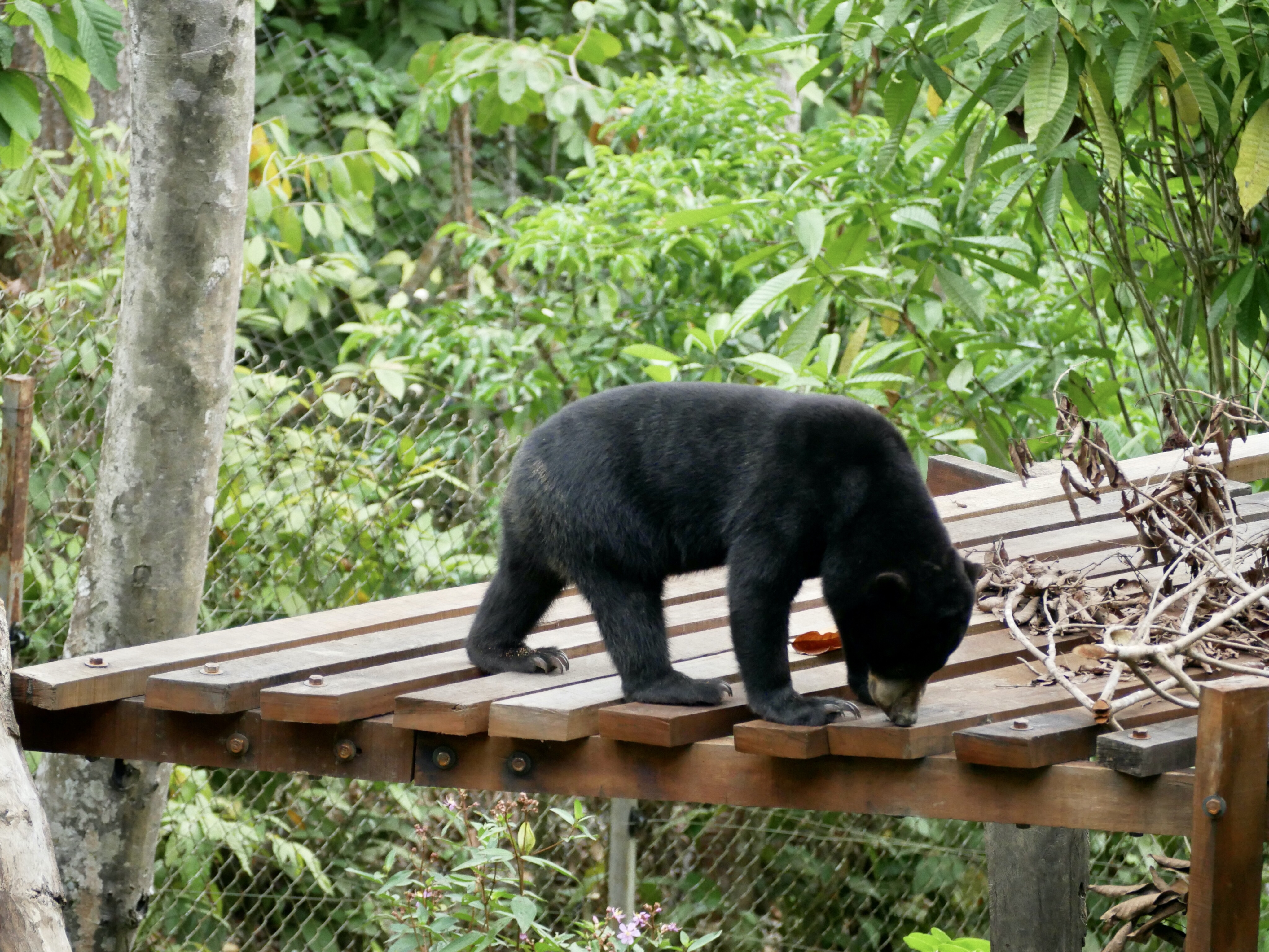 Dopoldne smo si ogledali center z orangutani, potem pa se sprehodili čez cesto, kjer so postavili še center za malezijske sončne medvede (Borneo Sun Bear). Sončni medvedi so najmanjša vrsta medvedov. Živijo v tropskih gozdovih in lahko plezajo na visoke krošnje dreves. Njihov žolč se uporablja v tradicionalni kitajski medicini in poleg krčenja habitata jih ogrožajo tudi divjo lovci, ki jih ilegalno prodajajo v medvedje farme v Vietnam in sosednje države. Medvedi so najbolj aktivni zgodaj zjutraj. Mi smo se tam pojavili zgodaj popoldne, ko so (tako kot mi) predvsem iskali senco pred žgočim soncem.