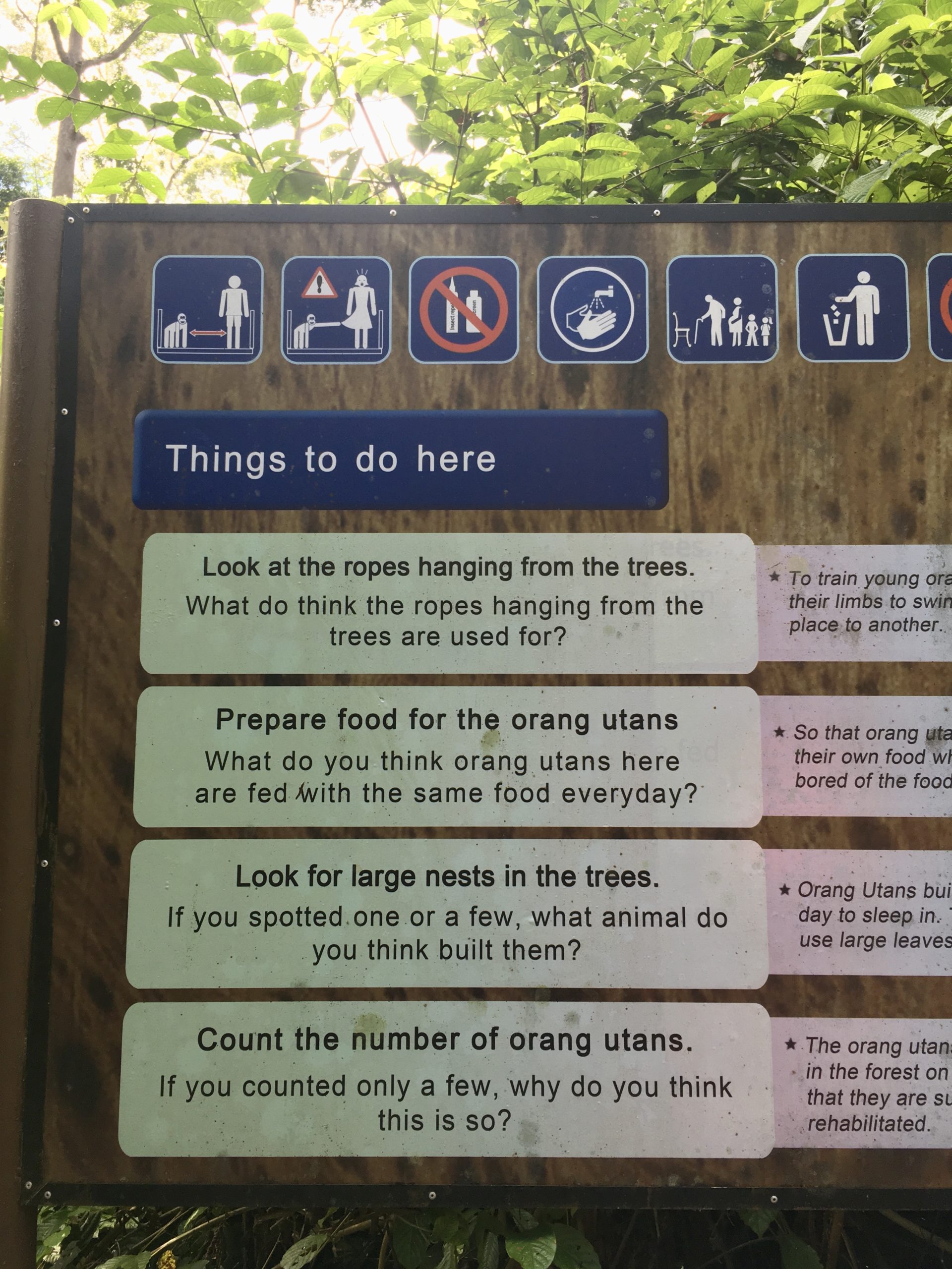 Večino otoka Borneo je včasih prekrival deževni pragozd, ki je bil v velikem obsegu izsekan in življenski prostor divjih živali se je zato drastično skrčil. V deževnih gozdovih Bornea prebiva tudi gozdni človek, orang-utan, in drugi dan je bil namenjen obisku Sepiloka, kjer so postavili rehabilitacijski center za poškodovane in osirotele orangutane. Zavetišče si je najbolje ogledati v času hranjenja, ko na glavno platformo prinesejo sveže sadje in zelenjavo. Orangutani se po vrveh, ki so speljane proti platforne, počasi prizibajo in se najedo dobrot. Turisti pa se gužvamo na platformi v upanju, da ujamemo čim boljšo fotko.